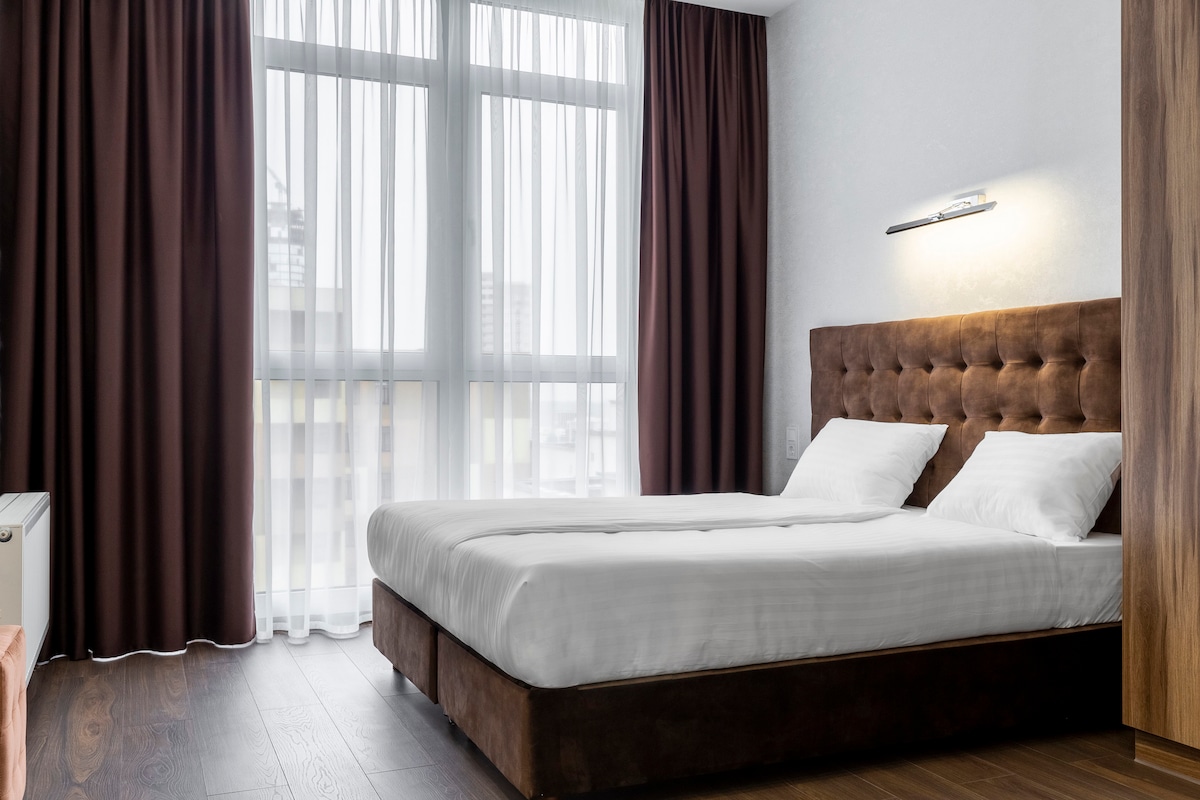barasport city apartments Deluxe bronze style can be your second home in the center of the city's business life! Deluxe bronze style is ideal for both people traveling on business, and for curious tourists. Located within 5 minutes walk from the metro station Pecherskaya, 15 minutes ride from the train station. Boryspil Airport is 33 km away from the property. The Deluxe bronze style apartment offers our guests a choice of two single beds or one large double bed with comfortable orthopedic mattresses, high-quality white linens, hypoallergenic pillows and blankets. Enjoy uninterrupted high-speed WiFi, a convenient workplace, as well as an LCD TV and a safe for storing valuables. The fully equipped kitchen gives you an option of having a homemade breakfast. A combined bathroom is featuring a shower and water heater for your convenience. There is also a washing machine, hairdryer and complimentary toiletries available at all properties. Panoramic windows overlook a quiet enclosed yard, which provides an excellent opportunity not only to have a good night sleep, but also to escape from the hustle and bustle of the city. All thanks to barasport city apartments!