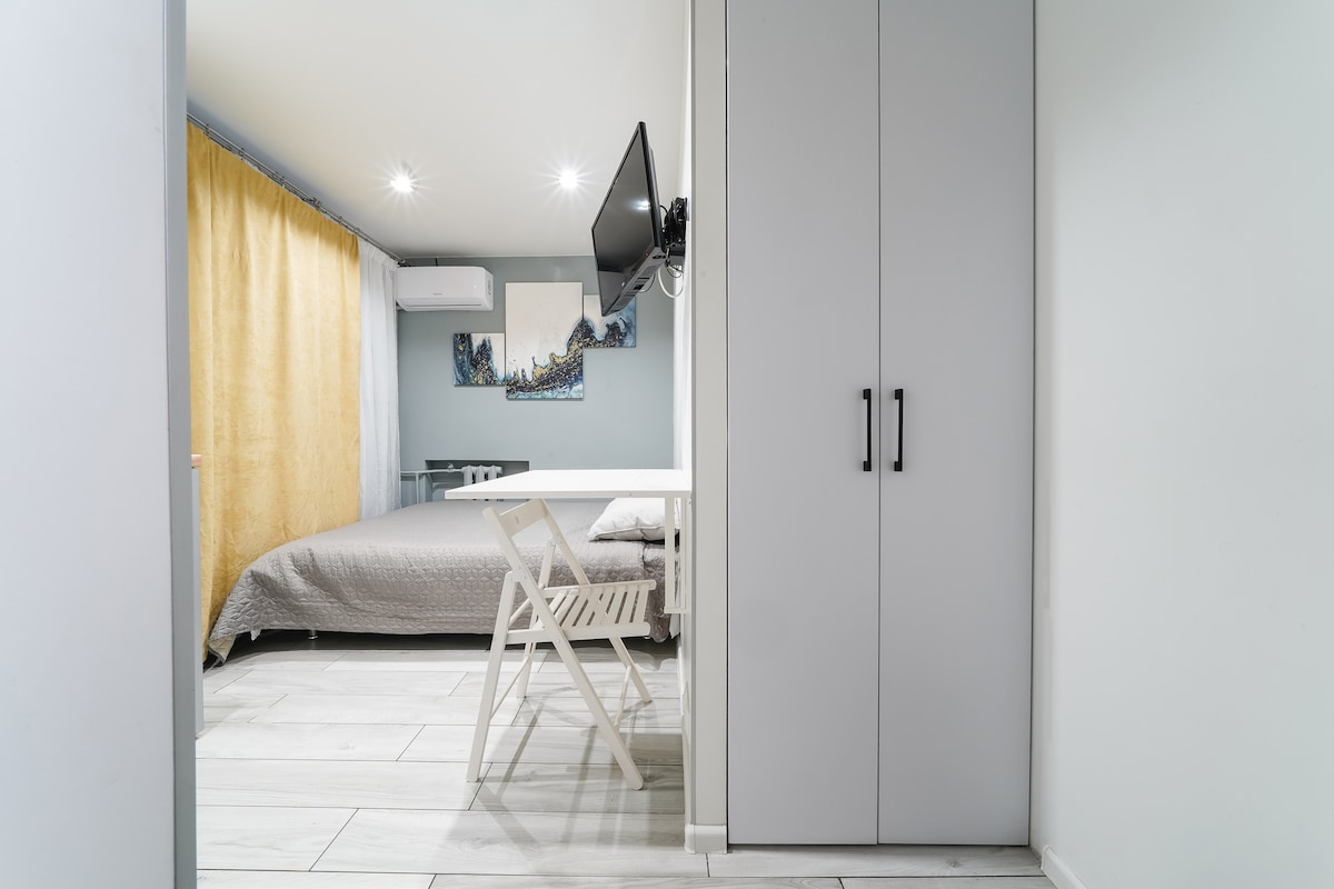 A cozy and modern studio in white and light gray tones on the 2nd floor. The building is located in the center of Kyiv near the shopping center "Gulliver", not far from the Olympic Stadium and Khreshchatyk Street, a 5-minute walk from the “Palace of Sports” metro station. The apartment has a queen-size bed and, if it is necessary, an additional fold-out bed. The studio has a small kitchen, bathroom and toilet with everything you need, smart TV and Internet.