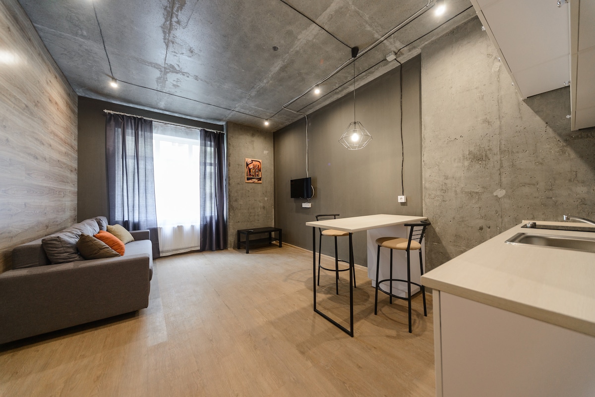 This is magnificent studio apartments with modern design interiors in loft style. The convenient location and unique design of the apartments will give you an unforgettable experience. The apartment is equipped with everything necessary for a comfortable stay. The main advantage of the apartments is their location in the business and cultural center of the capital. There are many shops, cafes, restaurants and a convenient transport interchange in five minutes from the house.