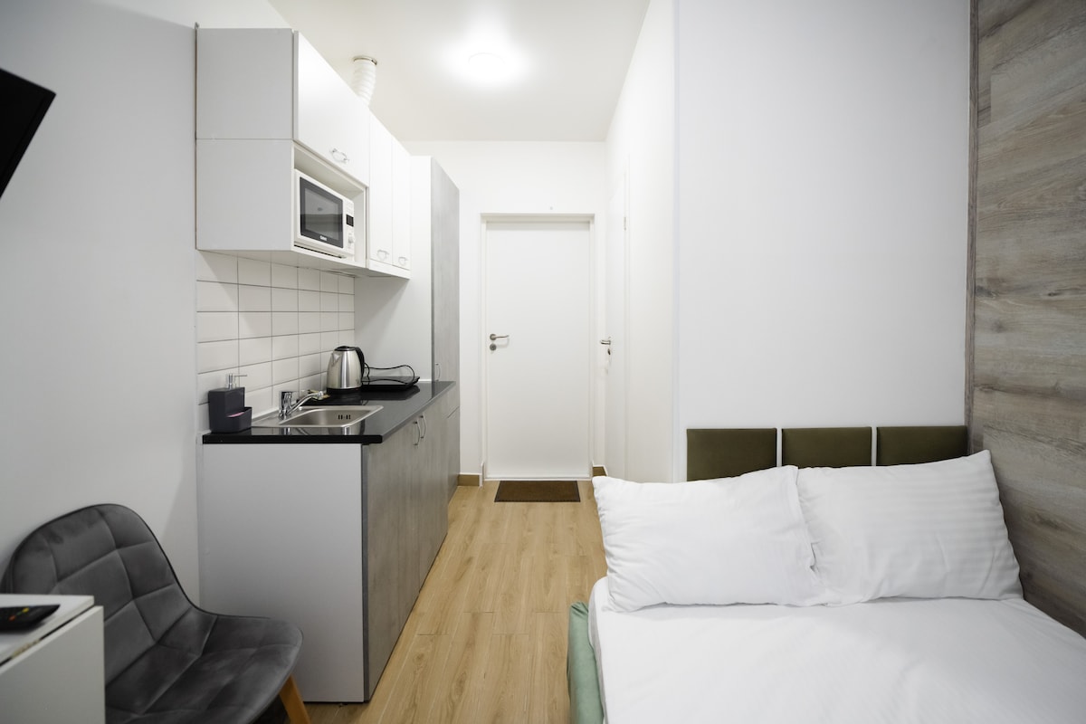 Comfortable and nicely decorated apartments are 28 sq.m. in size Maximum capacity: 1+1 or 2 guests An independent heating and air-conditioning system Free wireless (Wi-Fi) high speed Internet Writing desk Landline phone Plasma TV with digital terrest