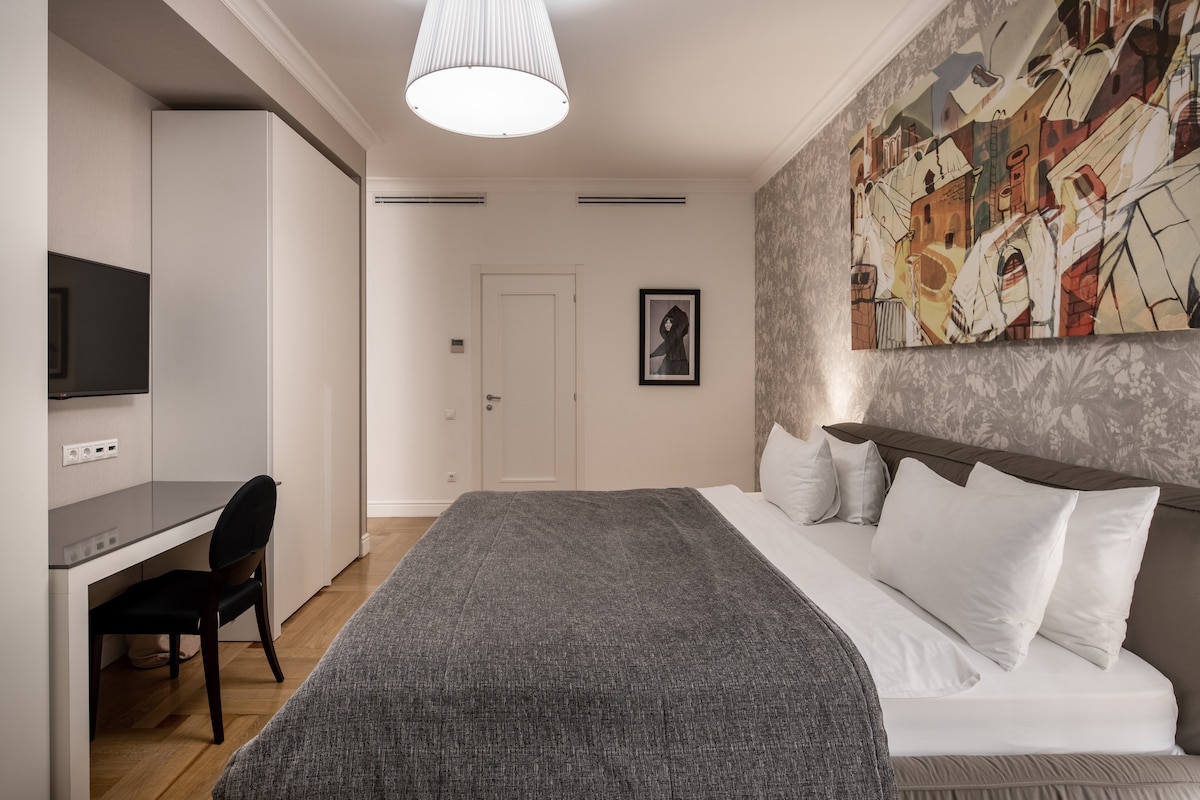 luxury 2 apartments in the heart of the capital. both are on the same 5th floor of a 6-storey building with an elevator. Elegant Italian furniture, beautiful design, comfort and cosiness will bring pleasure to you stay in this apartment. Every apartment with 3 separate bedrooms (total - 6 bedrooms), a spacious living rooms and kitchens, 3 bathrooms, two toilets ]The apartments is fully equipped with all appliances, kitchen and bath amenities. Internet WI-FI. Sleeps 12 (2+2+2+2+2+2).