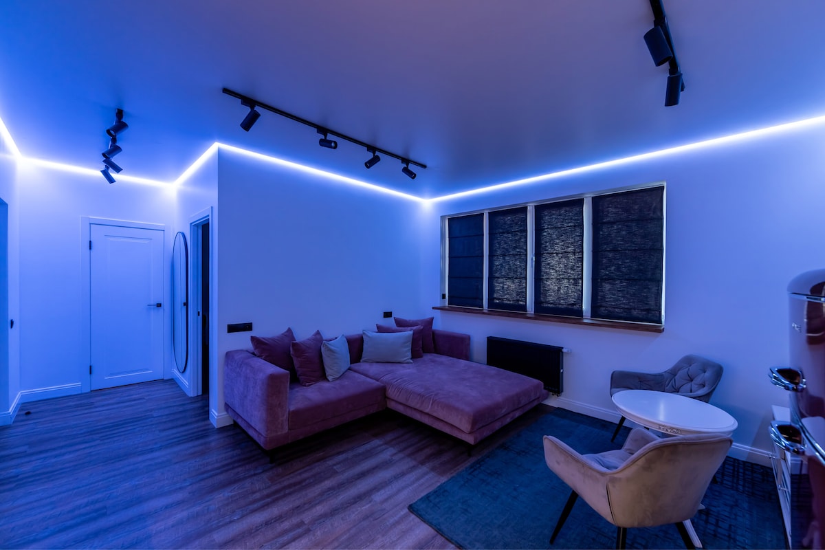 Take in far-reaching 180-degree city vistas from this 22nd-floor corner apartment. It features a concealed fireplace, along with a wealth of designer ceiling lights. This apartment is located in the Pecherskiy neighborhood. Although not teeming with tourists, Pecherskiy is still considered a part of downtown Kyiv. In fact, this neighborhood offers the best of both worlds: you are still in the middle of a buzzing city but don’t need to fight the tourist crowds.