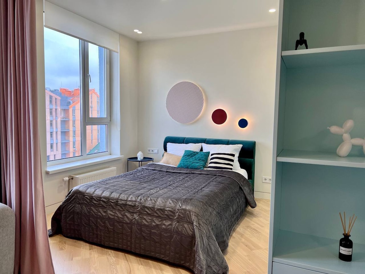 Amazing apartment in a heart of a city. Just few steps to subway station Khreshchatyk. Central department store, Maidan Nezalezhnosty (Independence Square), Bessarabsky Market (farm market) and a lot of boutiques, malls, supermarkets, ATM, restaurants and cafes, all you need you’ll find just in 2-10 min walking distance from this apartment. It’s a VERY CENTRAL part of the city. And despite this our apartment is in quiet place. All the windows and a huge balcony overlook a quiet courtyard.