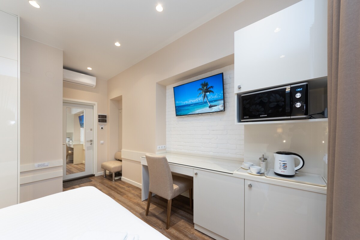 A cozy and modern studio in white and light gray tones on the 2nd floor. The building is located in the center of Kyiv near the shopping center "Gulliver", not far from the Olympic Stadium and Khreshchatyk Street, a 5-minute walk from the “Palace of Sports” metro station. The apartment has a queen-size bed and, if it is necessary, an additional fold-out bed. The studio has a small kitchen, bathroom and toilet with everything you need, smart TV and Internet.