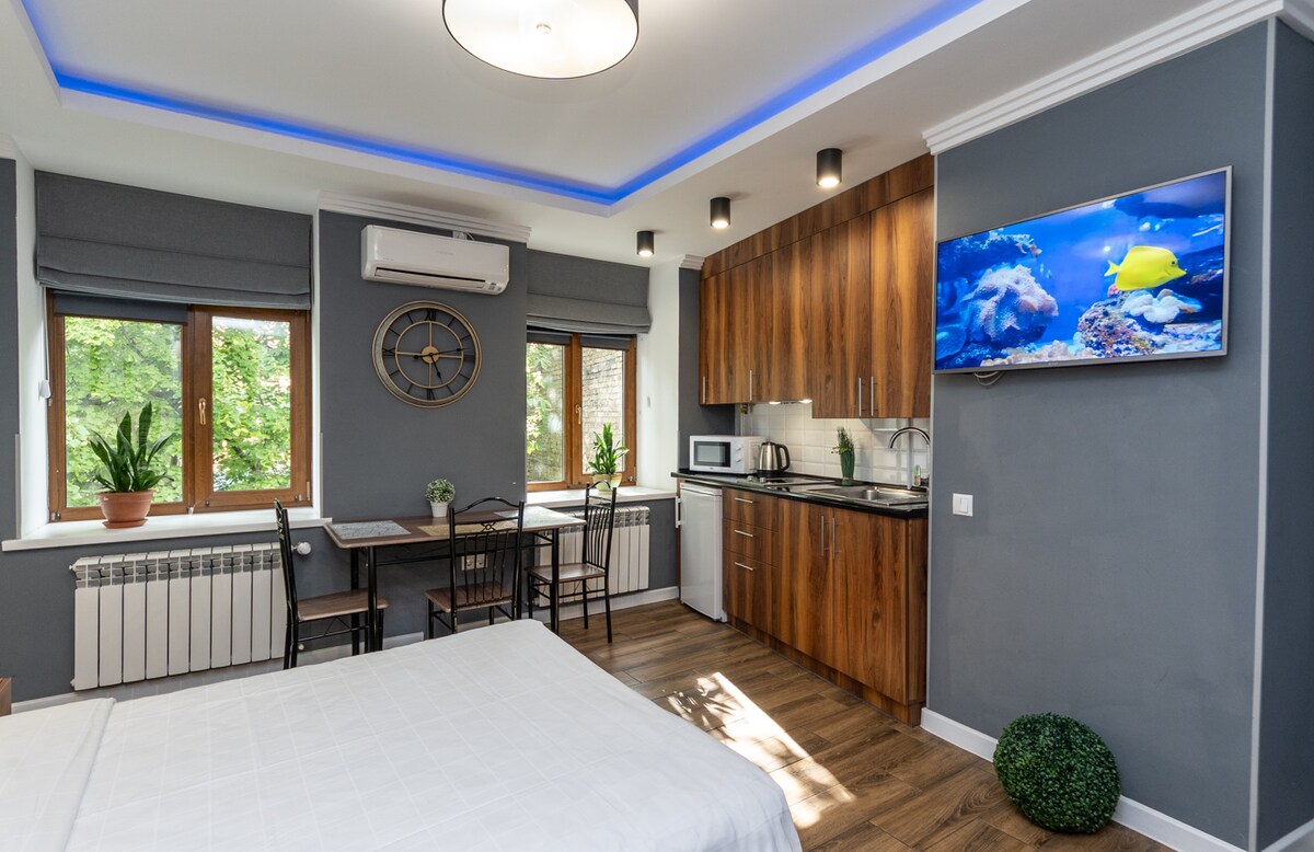 Cozy hotel room type apartment in a residential building. Luxury studio apartments located in the heart of the capital, in close proximity to metro, entertainments and shopping centers. Rooms are equipped with new technique and furniture. Our designers have added their unique to this apartments.