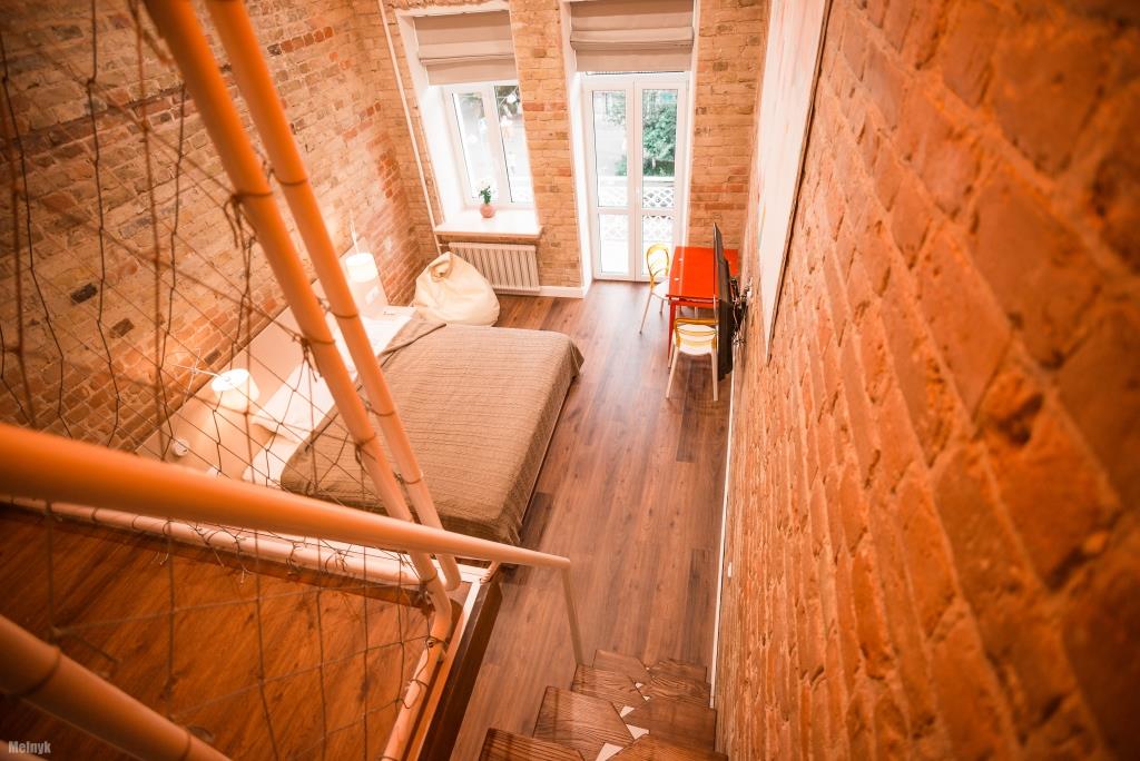 Cozy, small, beautiful two-level loft studio on the 4th floor of a historic building from 1917. The building with an elevator is located in the center of Kyiv near the Opera House. A 5-minute walk from the metro station "Universitet". The apartments are part of a small apart-hotel of 3 rooms. Inside is a king size bed, and on the mezzanine there are quality mattresses for 3 beds. The studio has its own small kitchen, its own bathroom with everything you need, TV, internet, etc. Welcome!