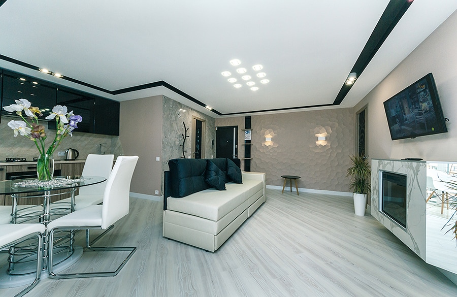 Take in far-reaching 180-degree city vistas from this iconic star building right in the heart of the city. It features a concealed fireplace, along with a wealth of designer ceiling lights. All art and ceramics seen in the apartment are made by local Ukrainian artists. The place has air filters, heated floors, washer and dryer, work desk, an amazing coffee machine, and much more for your most comfortable stay.