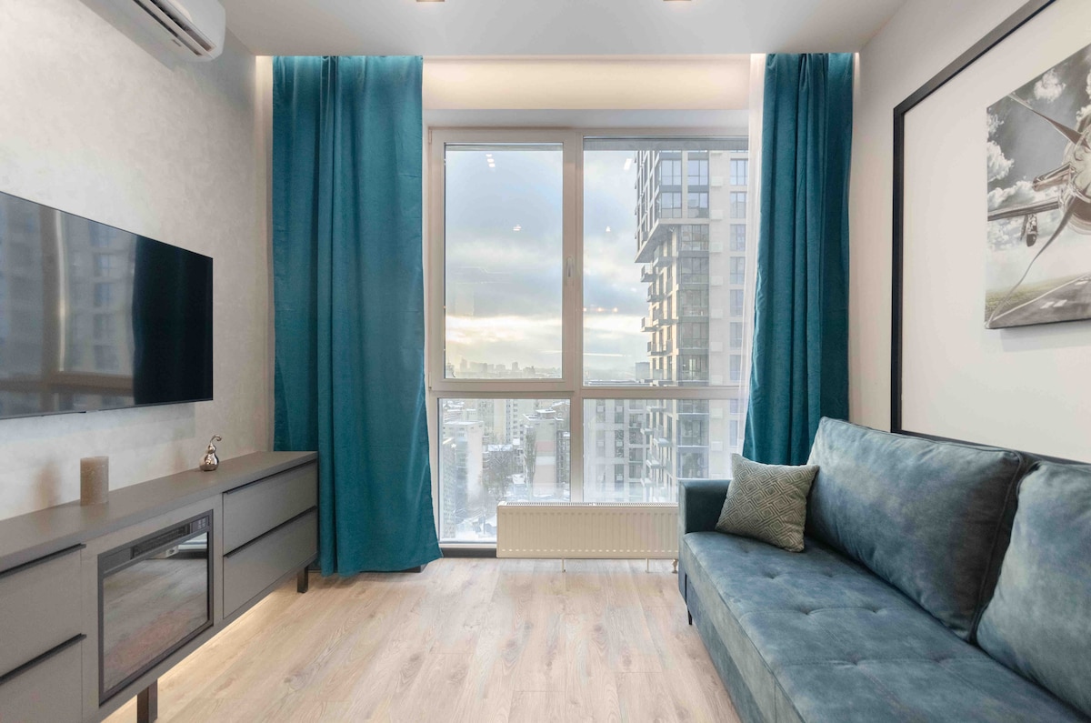 Квартира розташована на 6-му поверсі недалеко від метро Олімпійська (700 метрів). За лічені секунди можна дістатися надійного сховища - підземний паркинг у 14 маршах сходів. Вікна обернені від вулиці в середину двору. Супермаркет Мегамаркет у 400 метрах. Фото/відео зйомки потребують окремого погодження господаря. Stylish apartment in the very heart of the city of Kiev. Overlooking the sunset from the 6th floor of the modern highrise, an apartment complex CHICAGO Central House.