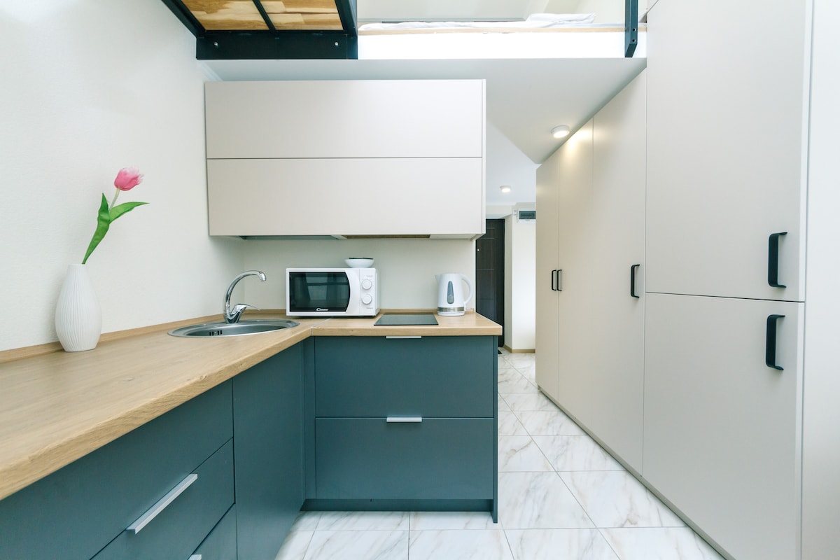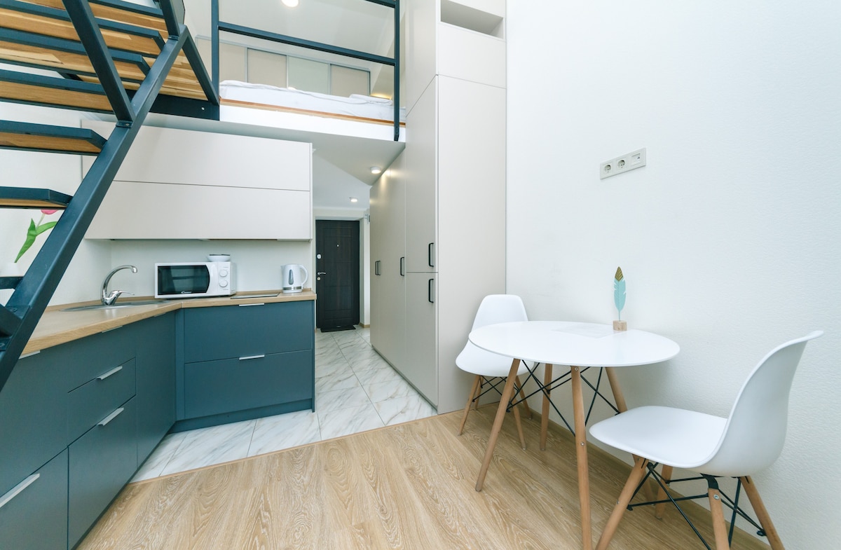 A cozy, small, comfortable two-level loft studio is situated on the 4th floor of a historic building that was built in 1917, that is located in the center of Kyiv near the Opera House and Khreshchatyk Street. “University” metro station is nearby within a 5 minute walk.This flat is a part of a small apart-hotel for 6 rooms. There is a king size bed inside the apartment and high-quality mattresses on the mezzanine. The studio has its own small kitchen and its own bathroom with everything you need.