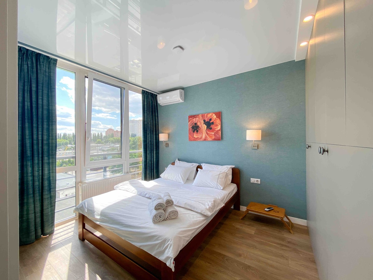 We are Welcome in your cozy apartment. The flat is equipped as for daily rent as for long rate living. We are offering two rooms apartment with marvellous view on Kiev left bank of the city and river Dnepr. We have separate bedroom, living room with kitchen and bathroom. You can be welcomed with very fast WiFi and free parking inside the building on closed territory.