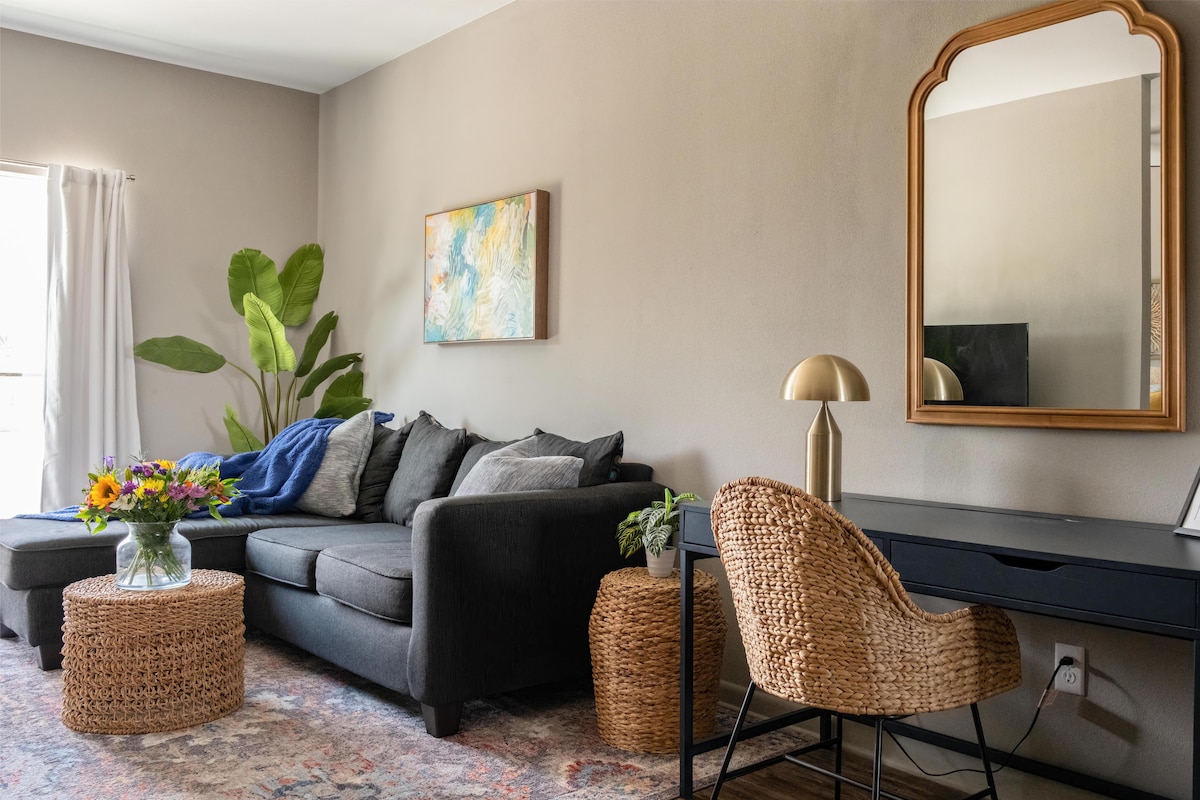 Relax in a brand new "Boho Modern" townhome located in the Historical Downtown Bryan & in walking distance to Ronin, Black Water Draw, RX Pizza, the Village, Cilantro, farmers market & many more Restaurants. Both bedrooms have king sized beds & master room/living room have 50 inch TVs. Log into your personal streaming account or use our Hulu, Disney+ or ESPN+, as a courtesy. Relax in private backyard or cook in the beautiful kitchen which includes a Keurig coffee maker with pods & creamers.