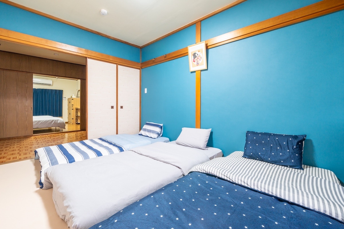 🏡【大阪港区三层日式独栋民宿|近地铁・可住16人】 交通超方便! 🚉 步行13分钟到弁天町站(有JR)—直达关西机场、USJ、神户 🚋 15分钟到大正站——直达难波、心斋桥 🚌 出门步行1分钟到公交站——可直达难波、大阪港、天保山(海洋馆)及大阪站(新干线) 🏠【房源简介】 位于大阪港区的三层独栋日式住宅,面积约130㎡,宽敞舒适: 4间卧室(双人床3张、单人床3张、榻榻米软床3张) 2个卫生间+2个淋浴间 最多可16位客人 厨房(电磁炉、冰箱、微波炉、餐具、炊具) 提供免费Wi-Fi、空调、洗衣机、毛巾、洗漱用品 超大客厅适合家庭聚会 楼内无电梯,需使用楼梯 🏪【周边环境】 步行1分钟到Lawson便利店 步行10分钟内有LIFE超市 步行10分钟可到京瓷巨蛋(大阪棒球场) 周边是日本生活社区,遍布人气美食:烧鸟、寿司、大阪烧、拉面等应有尽有 🌸【入住体验】 整栋民宿以温馨的日式风格设计,设有榻榻米房、拉窗与日式隔扇门,干净整洁、设施齐全。非常适合家庭或朋友团体入住,体验纯正的日本生活氛围。 ❤感谢您的入住! 欢迎您尽情感受大阪的热情与魅力!🇯🇵✨