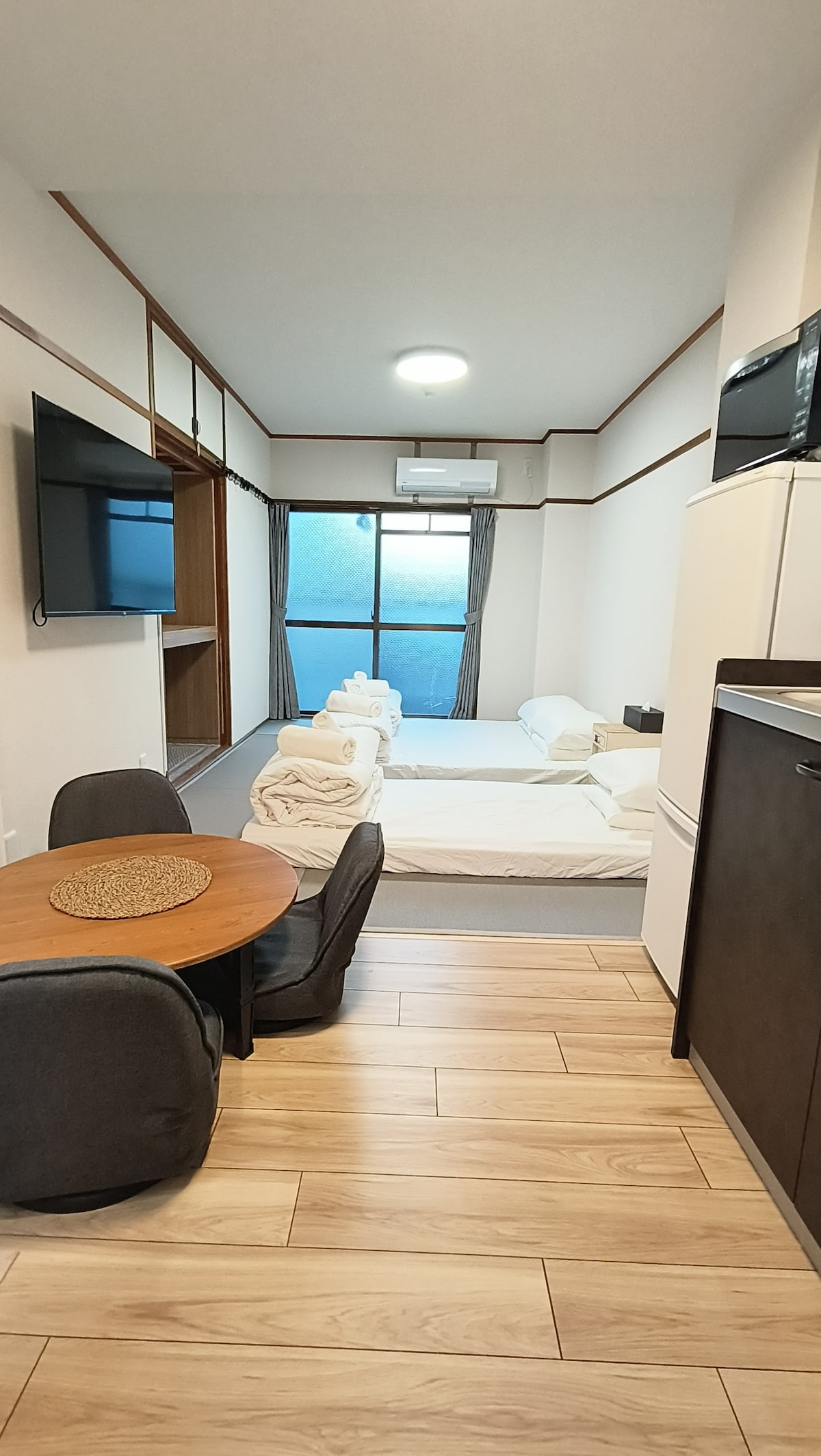很高興通知大家,現在我們大樓又新增了一間可以體驗日本榻榻米文化的和室房間。之前整棟大樓十幾個房間裡只有一間D2四人房是和室,因此很多顧客希望能住到日式榻榻米房型。2026年1月我們升級好了,變成新的一間和室房間C2,目前整棟大樓只有兩間和室房型,如果想體驗傳統日式房間感覺也不錯喔! 歡迎來到京都地點非常方便又安靜的住宿地點,讓您可以輕鬆又放鬆地享受京都之旅。 我們花了兩年的時間才找到這棟地點好、環境安靜又有電梯的大樓,接著又花了一年的時間很有誠意地與屋主談判,才終於有機會買下並經營這棟大樓。大樓裡多數住戶都是日本人,因此可以讓旅客更真實地體驗日本人的日常生活。 我們很用心把整棟大樓十幾個房間設計成不同特色風格,每一間房間的主題很多都是我們親自手工製作與彩繪完成,大約平均一個多月才會新增一間房間 目前我們在Airbnb三個帳號累積已有三千多個五顆星評價。寢具也特別挑選,許多旅客在評價中都提到床很好睡。房間清潔完全由我們親自整理,希望每位來京都旅行的旅客都能住得安心愉快