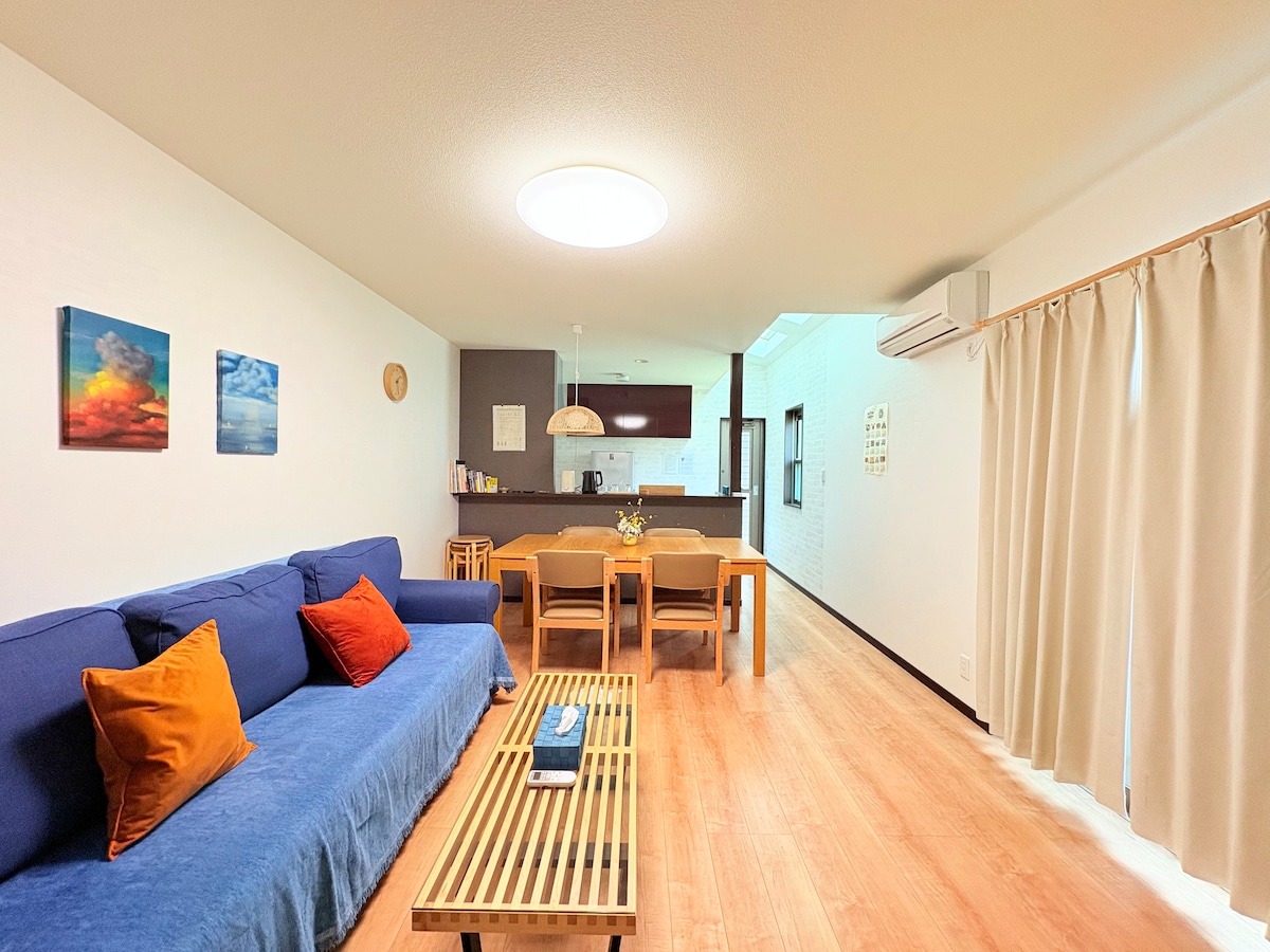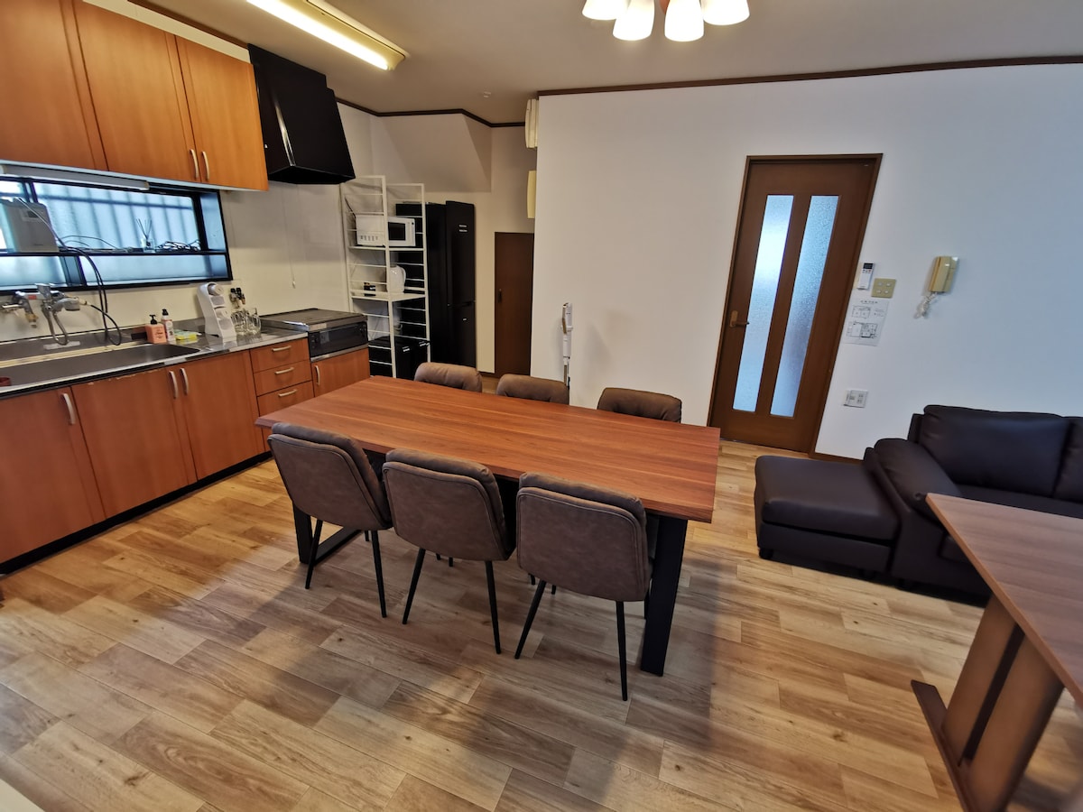 About the House 5-min walk from JR Shijonawate Station. 72㎡, 2-story entire house, up to 8 guests. 1F: Spacious living, dining, full kitchen. 2F: 3 bedrooms. Access: Kansai Airport 80min, Itami 40min, Shin-Osaka 30min, by car 15min from Daini-Keihan IC. Nearby: Convenience stores, supermarkets, McDonald’s – perfect for long stays. Beds: 3 double, 2 single, 1 sofa bed. Amenities: Wi-Fi, A/C, TV, washer, microwave, kitchenware, towels, shampoo, conditioner, body soap.