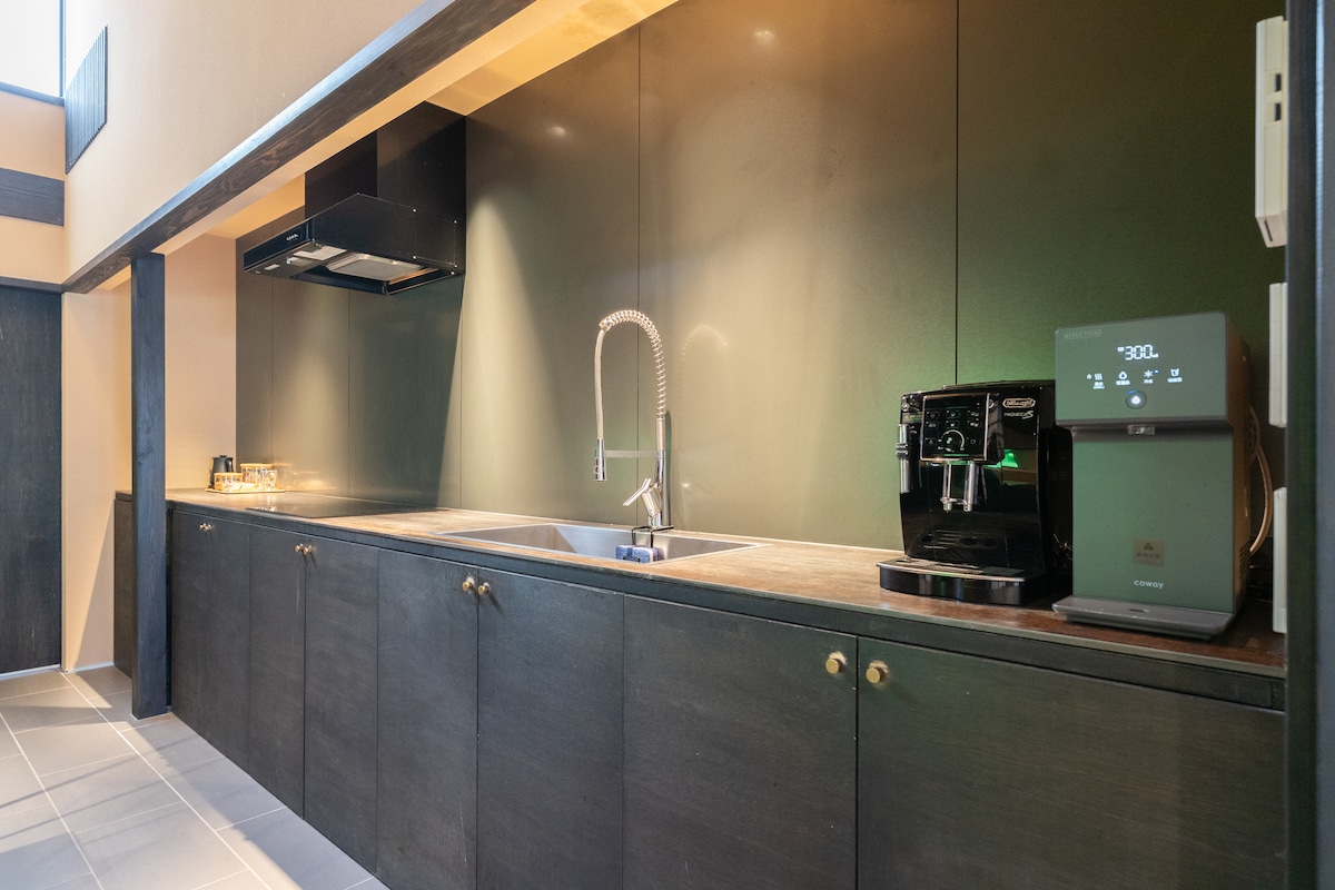 京町家貸切宿「高瀬川七条」は築115年の京町家をフルリノベーションした宿泊施設です。京都の美しい風景を形作る京町家を、当時の構造を残したまま、京都特有の蒸し暑い夏、底冷えの厳しい冬にも快適にお過ごしいただけるよう、気密性・断熱性能の高い建物に仕立て直しました。 1階の和室からは『露地』(※茶室へ通じる庭)をイメージした坪庭をご覧いただくことができます。また、廊下にはゆったりとくつろぎながら坪庭を眺めることができるようソファをご用意しました。夜にはライトアップされた坪庭を眺めながら、癒しの時間をお過ごしいただけます。 2階には寝室が2部屋あり、シングルベッド2台の部屋とダブルベッド1台の部屋をご用意しました。 5名様以上でご宿泊の場合は、少しご面倒ですが1階の和室にお布団を敷き、寝室としてご利用いただきます。 キッチンには簡単なお料理ができるよう調理器具と食器のご用意がございます。