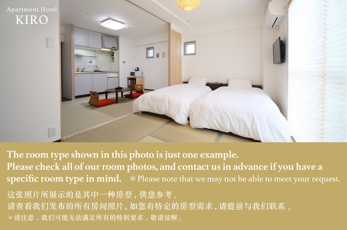 How about a Traditional Living Experience? Please request preferred room type. (Bed with Sofa or Tatami etc.). Japanese modern rooms, popular among guests, are also available. 9 minutes walk from Kyoto Station Hachijo Exit. 1F of the building is a 24H coin laundry(Renovated in 2023). Private kitchen inside the room. Free WIFI and luggage storage is available. Private parking lot by advance reservation only. (500 yen per night a car) . Rental bicycles (from 88 yen) within walking distance.