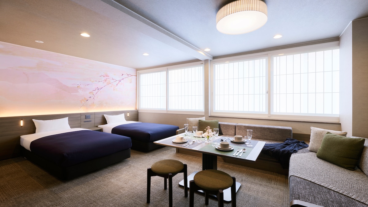 This room features 2 single beds, 2 futon sets, cooking utensils, and a kitchen, accommodating up to 4 guests. <Recommended Points> ■ Convenient location within walking distance of Shimizu-Gojo Station for sightseeing ■ Keyless stay with smart lock ■ Kitchen equipped with cooking utensils, electric kettle, and microwave ■ Perfect for long stays or business trips <Other Amenities> Air purifier, air conditioner, hair dryer, shampoo, conditioner, body soap, hangers