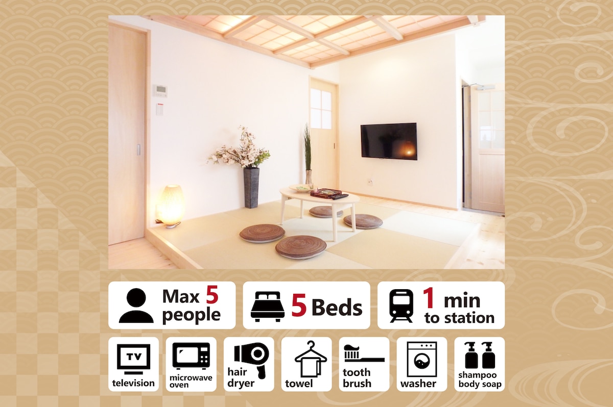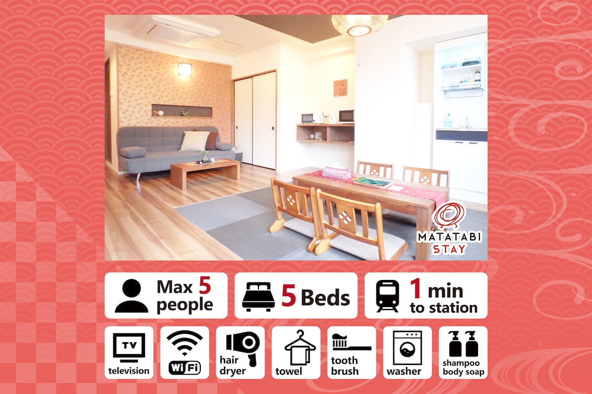 Spacious, modern 2nd-floor apartment just 1 min from Gojo Station! Perfect for families or groups up to 5 guests, with 2 bedrooms (3 semi-double beds) and 2 futons in the living room. Enjoy easy access to Kyoto sites, JR, and Hankyu trains—Osaka in 30 mins, Nara & Kobe in 1 hr. Close to Higashi Honganji Temple. No parties/banquets allowed, quiet hours after 9 PM. Book now for a cosy Kyoto stay!