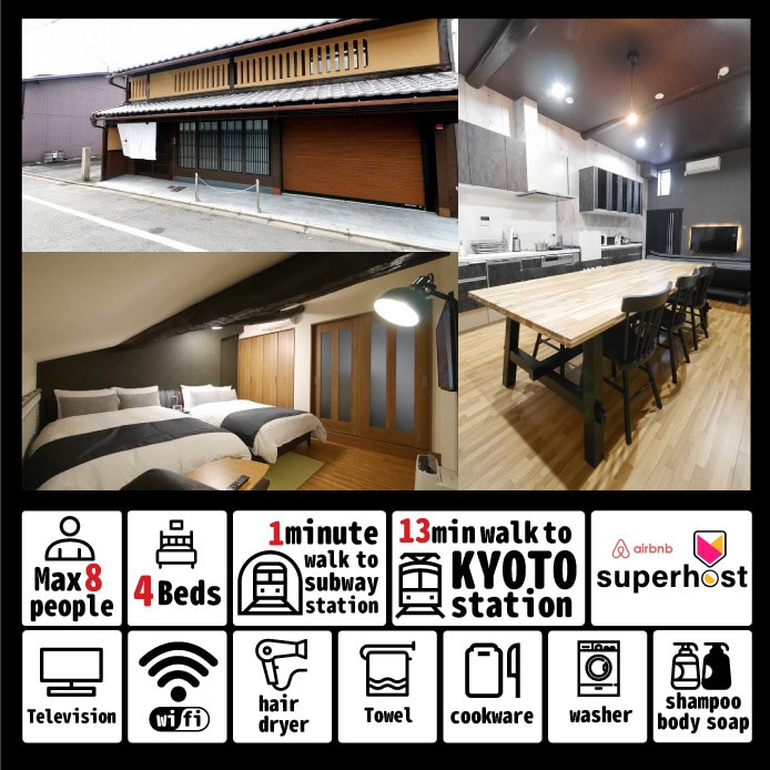 9人までお泊りいただける97㎡のスイートルーム!あなたのグループに一棟おご提供します。 京都市の旅館業法を取得した安心な宿舎です。 ・3DKと3家族9名様までお泊り頂ける広さ。 ・子供イス、ベビーカーをご用意。 (ご予約下さい) ・最寄りの駅はどこ! 京都駅から 徒歩10分 地下鉄五条駅 徒歩3分 京阪電車清水五条駅 徒歩6分 ・多人数で泊まりたい! 季楽庵北は9名様、隣の晴樂と合わせて18名様までお泊り頂けます。 ・料理を作りたい! IHクキング、電子レンジ、炊飯器等ご利用できます。 ・洗濯をしたい! 乾燥機付きの洗濯機と浴室乾燥機をご利用できます。 ・大阪、滋賀、奈良にも行きたい! 京都駅から滋賀県へは10分、大阪、奈良へ約30分と便利です。 ・チェックイン 午後3時から午後8時までにチェックインをお願いします。 (厳守) ・アーりチェックイン 早いチェックインをご希望でしたら時間を教えて下さい。 出来る限り対応いたします。 昼頃頃来られたら、清掃中の場合は荷物を預かります。 清掃が終わればチェックインできます。 す。
