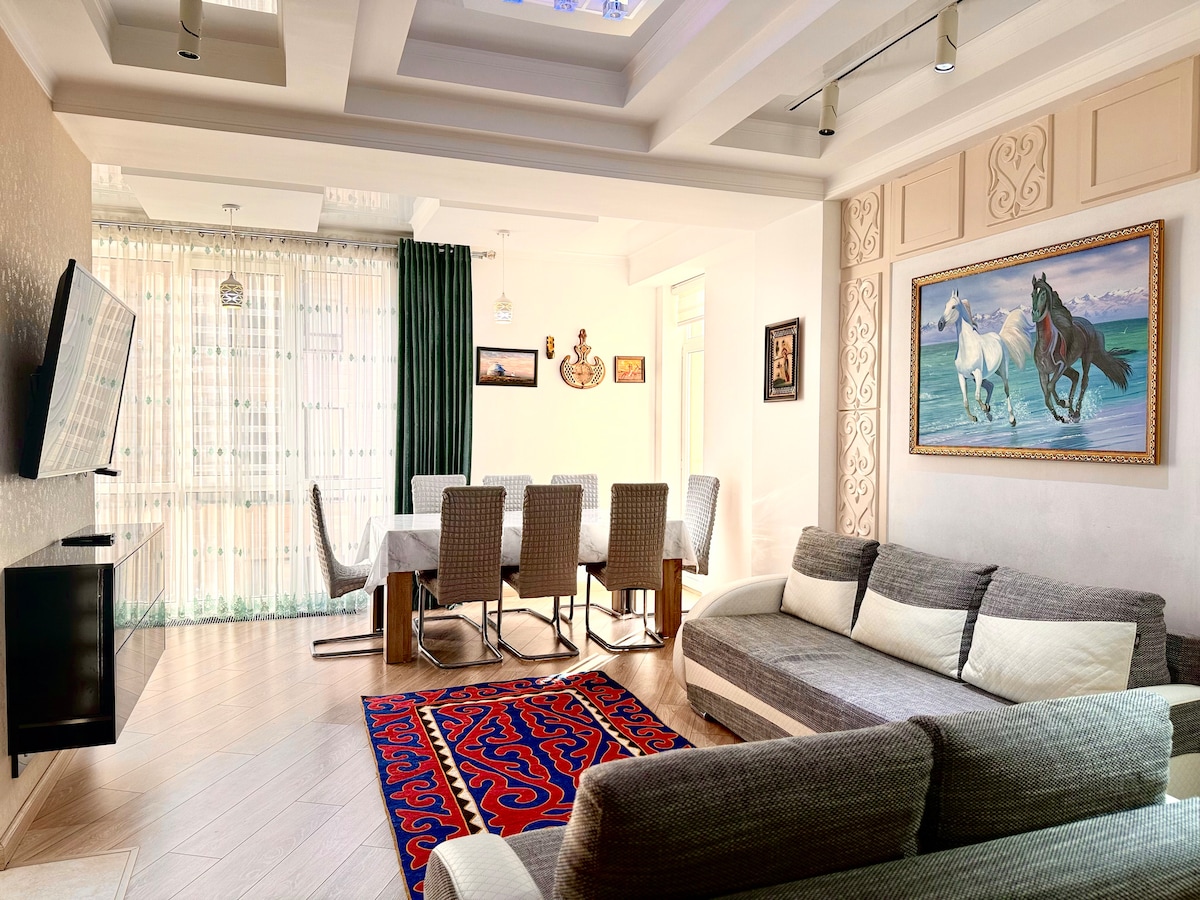 Modern & spacious apartment in new building in Bishkek with home spirit, cozy balcony to mountains. Good atmosphere & energy thanks to yoga & meditation. Calm & good-natured neighbors. Nearby Philharmonic Hall, Ala-Too Square, Panfilov Park, theatres & museums (art galleries), many restaurants, cafes, wine bars, malls. The host has strong Kyrgyz hospitality spirit, speaks Kyrgyz, Russian, English & French languages & loves to host and to talk with open-minded people from all over the world.
