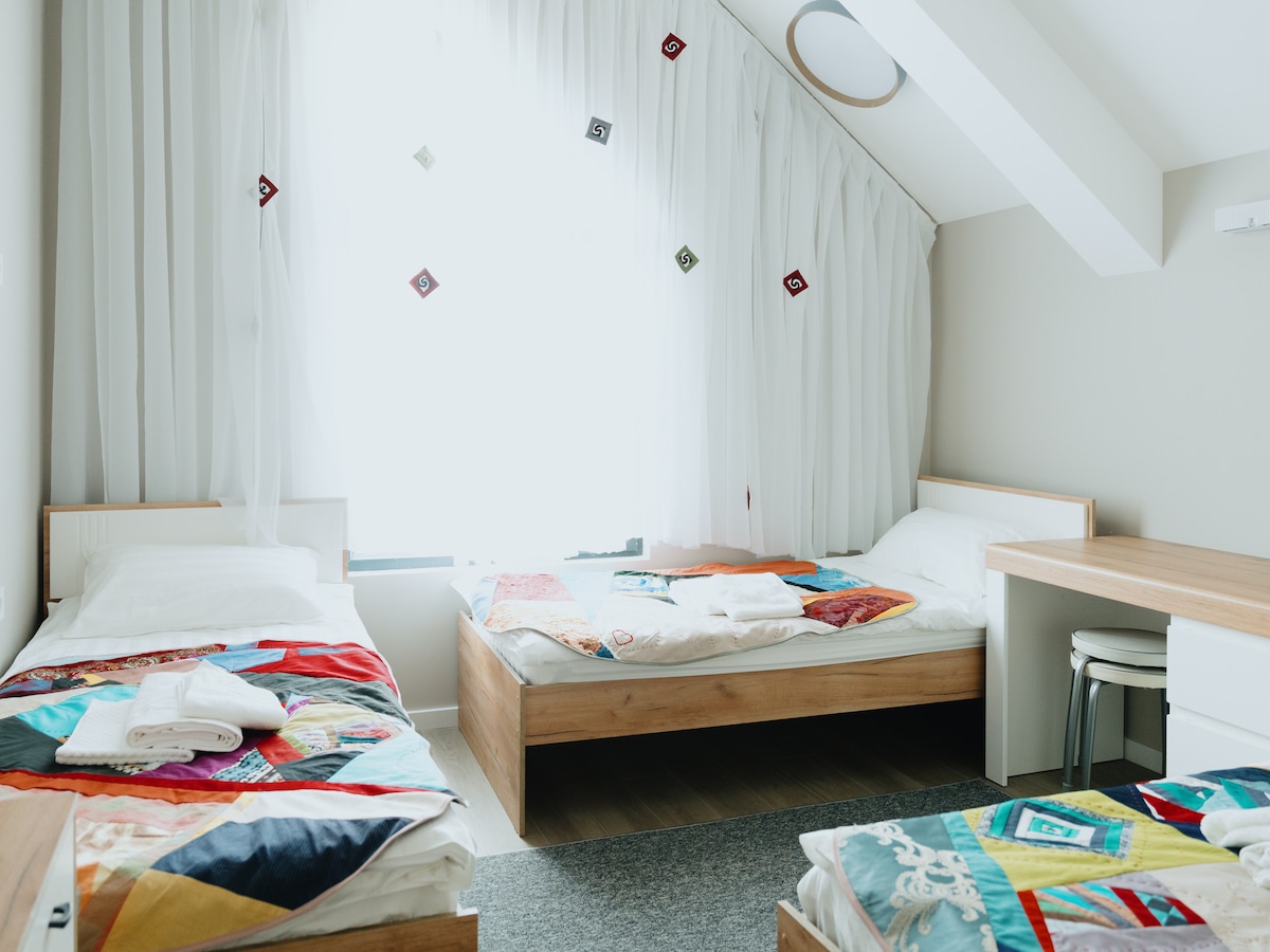 Привет, на связи гостиница Eva at Home, мы маленькая и уютная гостиница в гор. Бишкек. Мы открылись в декабре 2022г., в гостинице вас ждет свежий ремонт, новая мебель, постельное белье и полотенца У нас есть все для комфортного проживания: 1. реально быстрый интернет 100mb/s 2. удобные широкие кровати 90 см. 3. кофе машина, чайник, микроволновка и холодильник 4. стиральная и сушильная машина 5. чистые полотенца и халаты 6. средства гигиены в душевых 7. фильтр с питьевой водой 8. чай и снеки
