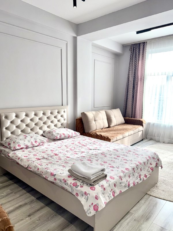 Fascinating view of the mountains and the city! New and stylish renovation with a fully equipped kitchen. Prestigious and ecologically clean area. Round the clock security. There is a park with bike paths nearby. Round-the-clock supermarkets and shopping centers (Asia Mall and Ala Archa) On the line of the main street of Bishkek, which leads to the mountains and the city center. Convenient transport interchange. The location allows you to quickly get to the mountains and the city center.