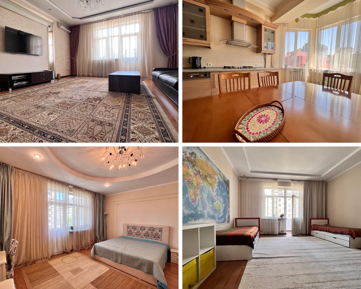 Are you looking for a safe, quite place to live in Bishkek? Here is spacious (140m2) apartment in the heart of Bishkek.The apartment is located in a secured courtyard, the house has only 2 entrances. The apartment is fully equipped with appliances (washing machine, water heater, dishwasher, air conditioning). The rent includes cleaning services (once a week). It is 30 mins of walk to museums, 5 mins of walk to green Erkindik Boulevard. 10 mins owalk to the street with restaurants, cafes.