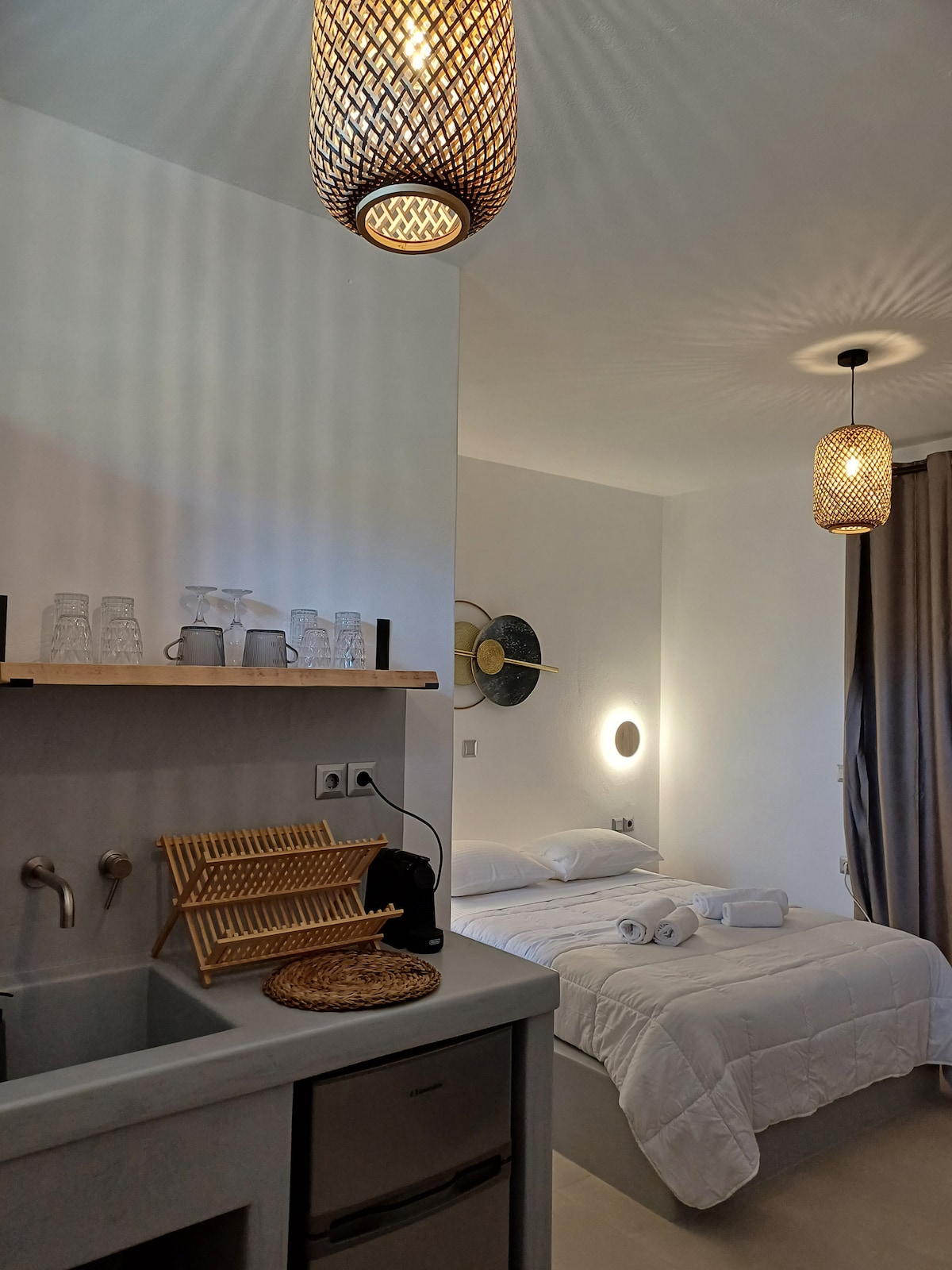 Απολαύστε τη μαγευτική ομορφιά του δειλινού στο Aurora Studio. Σχεδιασμένο να αιχμαλωτίζει το τελευταίο φως της ημέρας, αυτό το στούντιο διαθέτει ένα διπλό κρεβάτι και δυνατότητα ράντζου. Αποπνέει ζεστασιά και γαλήνη, προσφέροντας έναν ήρεμο καταφύγιο όπου ο απογευματινός ήλιος φιλτράρεται μέσα από τα κύματα.
