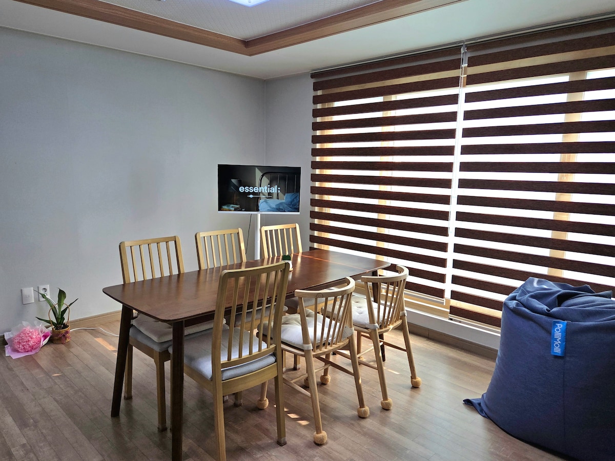 🫧미스터멘션의 특례를 적용받아 합법적으로 운영하는 숙소입니다.🫧 안녕하세요:) check-In 〰️pm 15:00 check-out 〰️ am 11:00 (✨체크인, 체크아웃 시간 조정 가능✨) 거실1, 침실2, 주방 건식 세면대, 샤워실, 화장실, 드레스룸 으로 구성되어있으며 최대 7인까지 이용 가능합니다. 호스트가 직접 관리하는 숙소로 안심하고 이용 하실 수 있습니다.