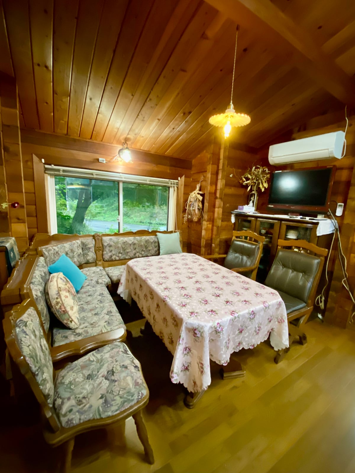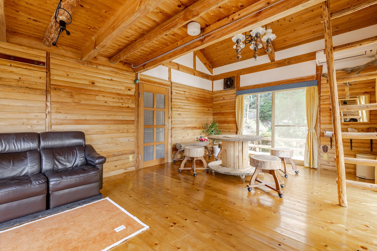 It's a big log house. The first floor consists of a large hall and a kitchen. Log houses also have excellent heat insulation and soundproofing. Even if the guest plays a musical instrument, it will not bother the neighbors. Accommodation is in the bedroom on the second floor and between tatami mats. You can also relax in the living room on the second floor. On the second floor, there is a gate on the stairs, so even small children can play in safe. High-speed WIFI and free parking.