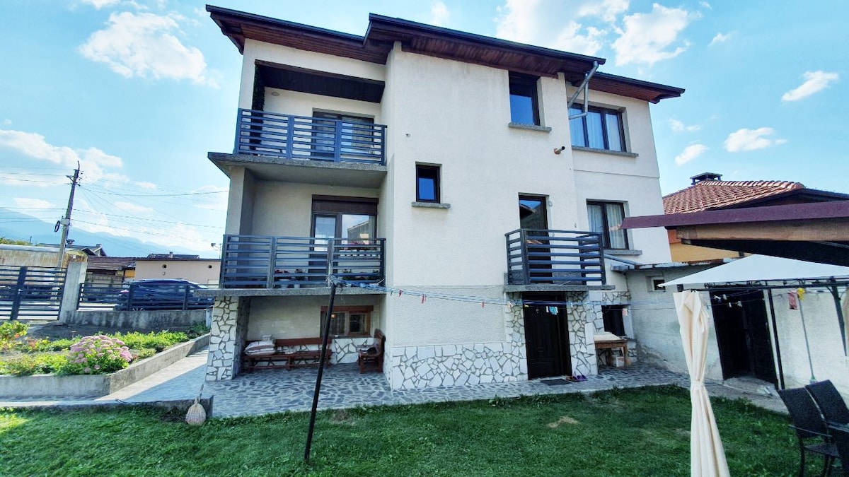 Relax with tYoSi Apartment in Sapareva Banya is a cozy rental home ideal for tourists. It features two bedrooms (one double bed, one with two singles), one bathrooms, a fully equipped kitchen, and a comfortable living room. The property boasts a large garden with stunning mountain views, an outdoor hot tub, sauna, and BBQ area. Enjoy fresh air and relaxation in this peaceful retreat, perfect for families or groups.
