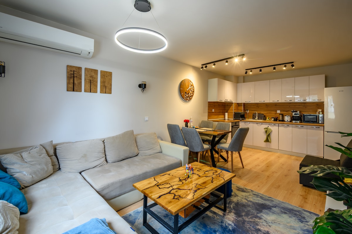 Welcome to our luxurious apartment, newly renovated with a modern design. The apartment features a cozy bedroom, a bright living room with a fully equipped kitchen, and a compact yet functional bathroom. Ideal for couples or business travelers, the apartment offers top-class amenities and an elegant interior that combines style and comfort. Just a 5-minute walk from the metro station and close to the Business Park. We look forward to welcoming you!