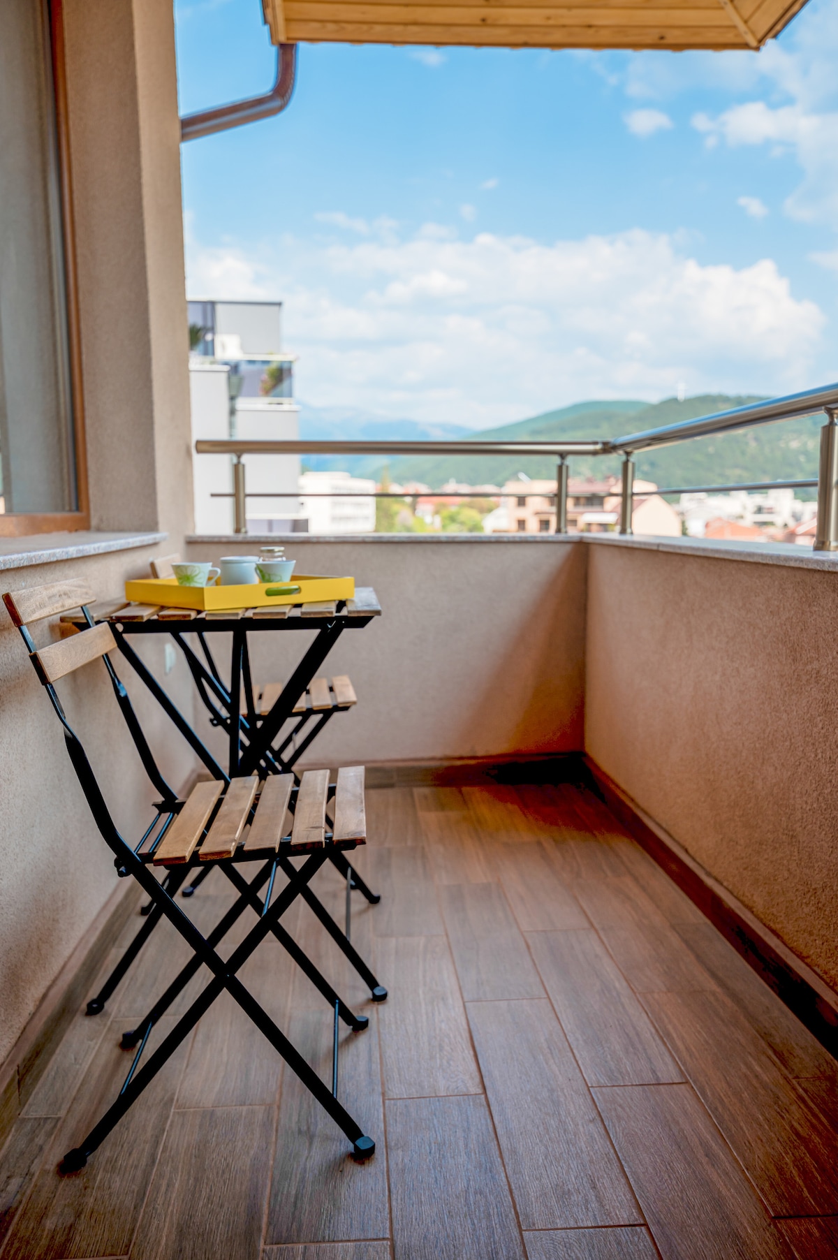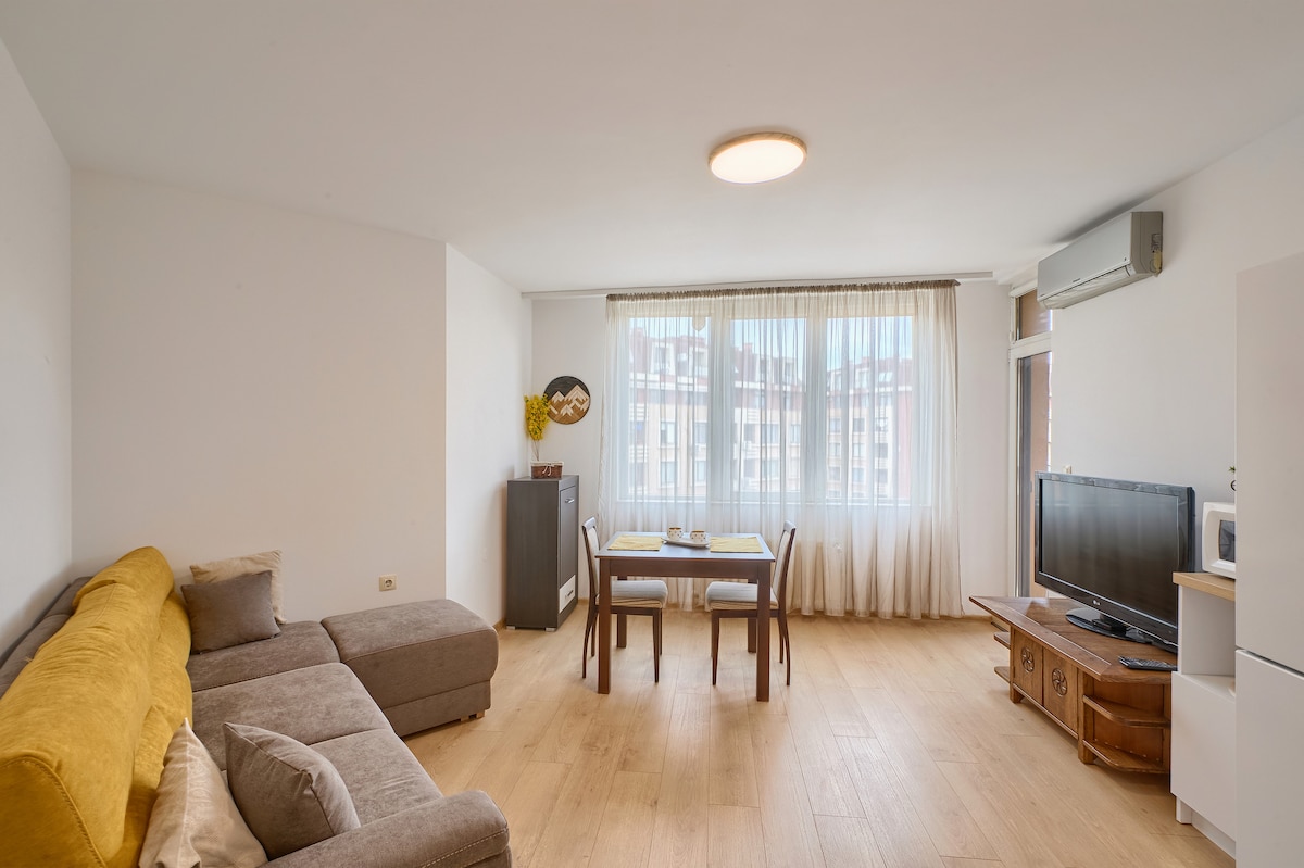 A brand new inviting apartment with a great view of Vitosha mountain. Furnished in a contemporary interior style, which makes it feels airy and spacious. The apartment is located in a private complex, on the 9th floor. A cozy and comfortable place! Just 8min walk from Inter Expo Subway Station and 10min away from the city center by car. It is also convenient to get to the airport, both by subway and taxi.