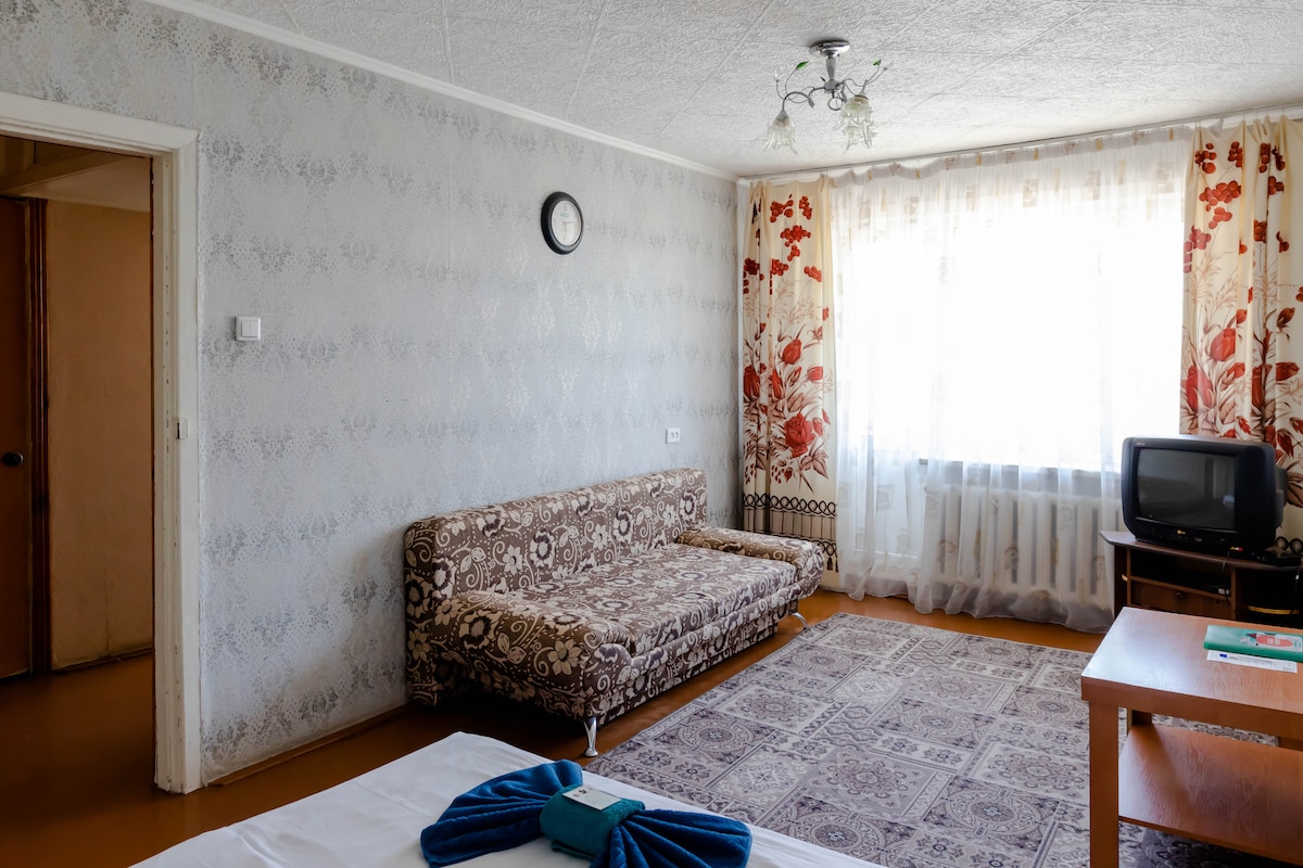Апартаменты с бесплатным завтраком. ⠀ В апартаментах: В зале: 2х спальная кровать 160*200, раскладывающийся диван ,телевизор с кабельными каналами, тумба, кондиционер выход на балкон Кухня: холодильник, варочная поверхность, микроволновая печь, кухонный стол, кухонный гарнитур, стиральная машина автомат Апартаменты расположены в тихом дворе на пересечении улиц Н.Назарбаева и ул. Интернациональной. Вся необходимая посуда для приёма и приготовления пищи. WI-FI, фен, утюг и гладильная доска.