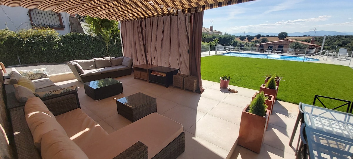 Welcome to your private Oasis in Madrid. Enjoy an exclusive villa ideal for families, groups or couples. Surrounded by nature, equipped to relax, celebrate or simply disconnect. What do we offer in our villa? . Up to 10 guests comfortably. . Private swimming pool with lounges and natural lawn. . Broad garden, perfect for children or relax. . Barbecue area with outdoor table. . Hall with Smart TV, wifi and aerothermia. . Full kitchen equipped with everything you need.