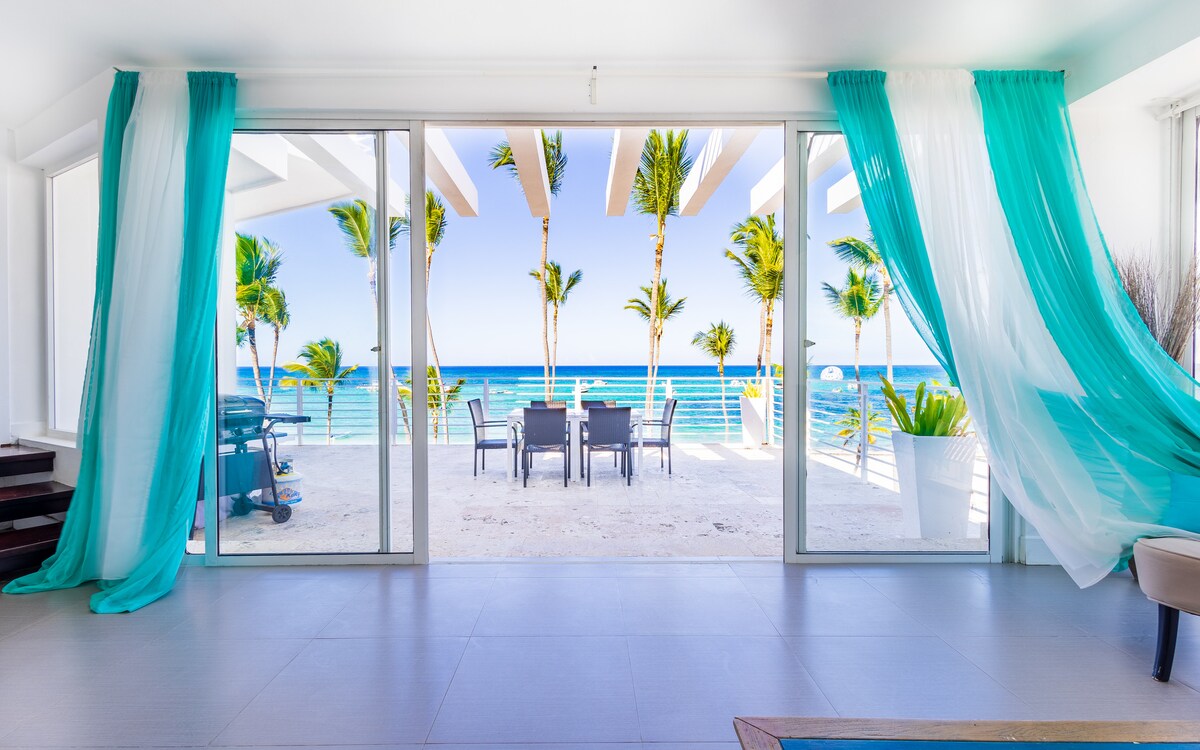 Relish an idyllic retreat where palm trees and the ocean fill your every moment! This spacious and fully furnished 4-bedroom beachfront penthouse has an equipped kitchen, a living room, and a roof terrace with chaise lounges and a BBQ! Modern condo for 10 guests in Punta Cana with complimentary beach sunbeds. Book now and enjoy Bavaro Beach! Important: Please note that the elevator is temporarily out of order.