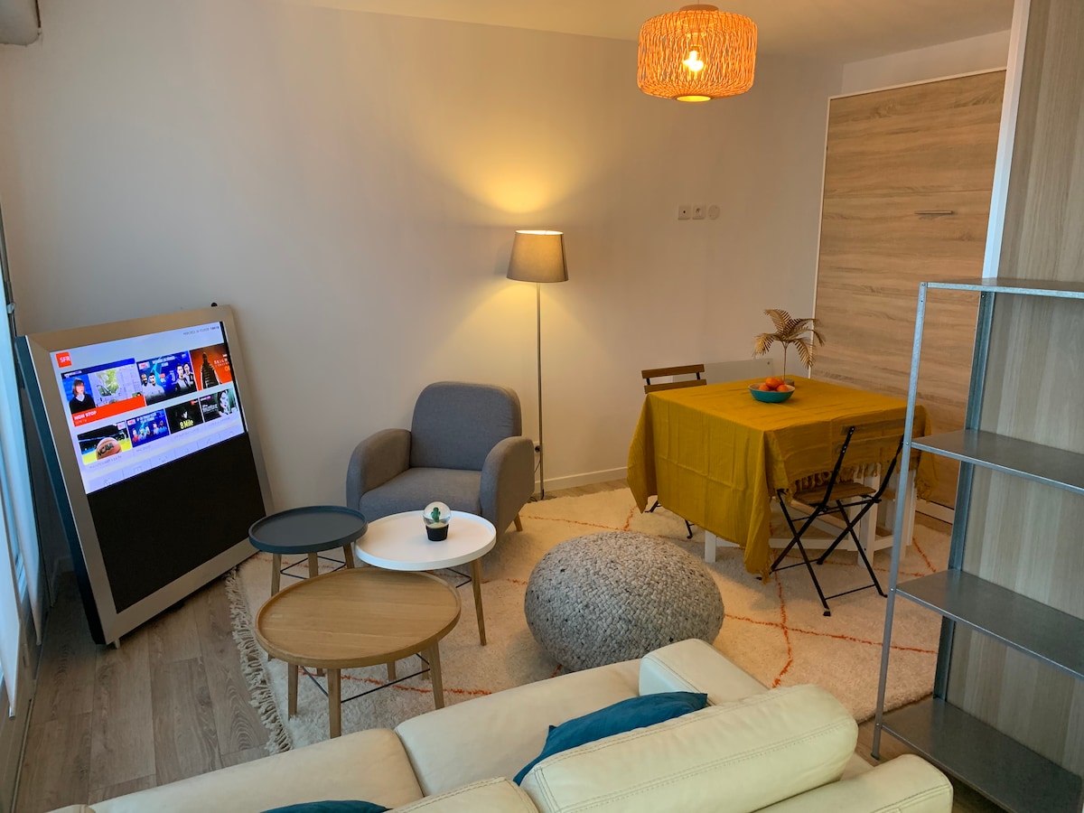 Simplifiez-vous la vie dans ce logement paisible et central. très bien situé, tout à moins de 10 mn à pieds (plage, gare SNCF , TGV direct vers Paris, marché tous les jours, avenue commerçante, un petit carrefour marcket , boulangerie pâtisserie) J'habite à côté dans le même jardin, je serai donc à votre disposition, mais tout le jardin sera à vous ainsi que le mobilier de jardin. Je peux éventuellement ajouter un lit pliant de 90. la salle de douche et les WC indépendants ont une fenêtre.