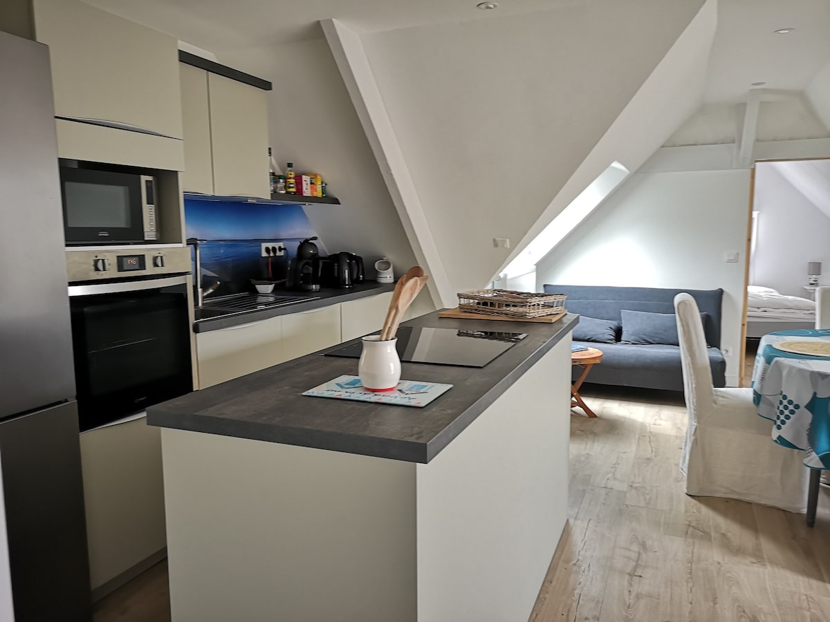 Flat T2 with hotel services **** , facing the sea, attic, velux balcony, lift and air conditioning. One bedroom, bath. We will welcome you personally in our house, you will find all the comfort and services of a hotel, the bed linen and towels have been carefully chosen, the beds and duvets are cosy and comfortable. We will be at your disposal during your stay.