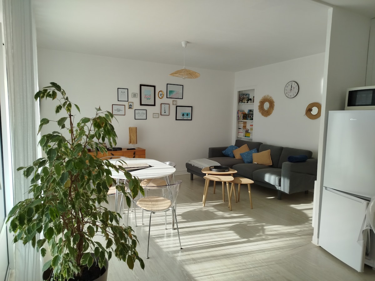 Plage, thalasso Rivage, voile à 5 min à pied. Grand et lumineux studio 2/4 pl de 31 m2 entièrement rénové au cœur de La Baule les pins avec balcon orienté ouest au dernier étage. Salon avec canapé convertible en 140 cm et un vrai lit de 140 cm.Cuisine entièrement aménagée et équipée, coin repas, salle de bains avec douche et WC.WIFI + fibre. Commerces, restaurants, marché à pied. Gare TER à 5 min à pied. Linge de maison et draps fournis.Laverie à 50 m de la résidence. Arrivée autonome