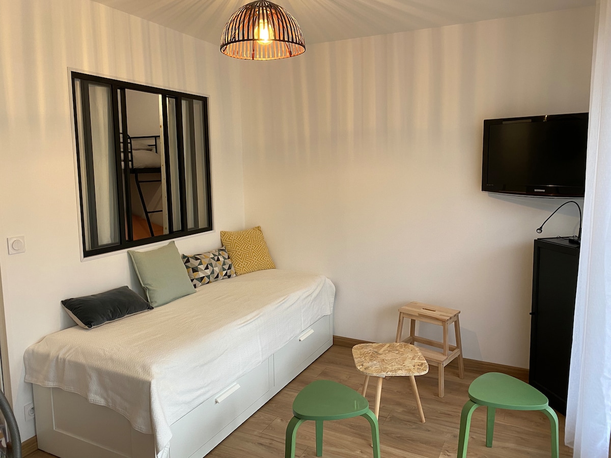 Océlya est un nid douillet entièrement rénové, idéal pour un séjour à deux ou avec bébé. Canapé-lit, TV connectées, cheminée, cuisine équipée, douche balnéo, machine à laver. Chambre cosy avec literie confortable. Draps, serviettes et essentiels fournis. Jardin privatif de 24 m² exposé plein sud, clos, sans vis-à-vis, avec barbecue et méridiennes. Animaux bienvenus. Calme, confort et charme à moins de 500m de la mer et de nombreuses activités : équitation, tennis, padel, casino, mini-golf.