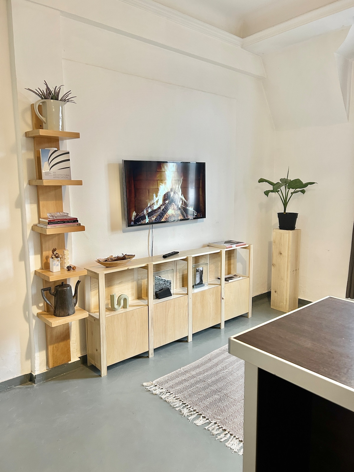 Cook breakfast in a kitchen with vivid wood cabinetry and dine at a traditional table within the open layout of this relaxed studio. Sprawl out on the sofa for a quiet moment of reading. In the evening, unwind with a cocktail on the leafy balcony. Wifi 100MG