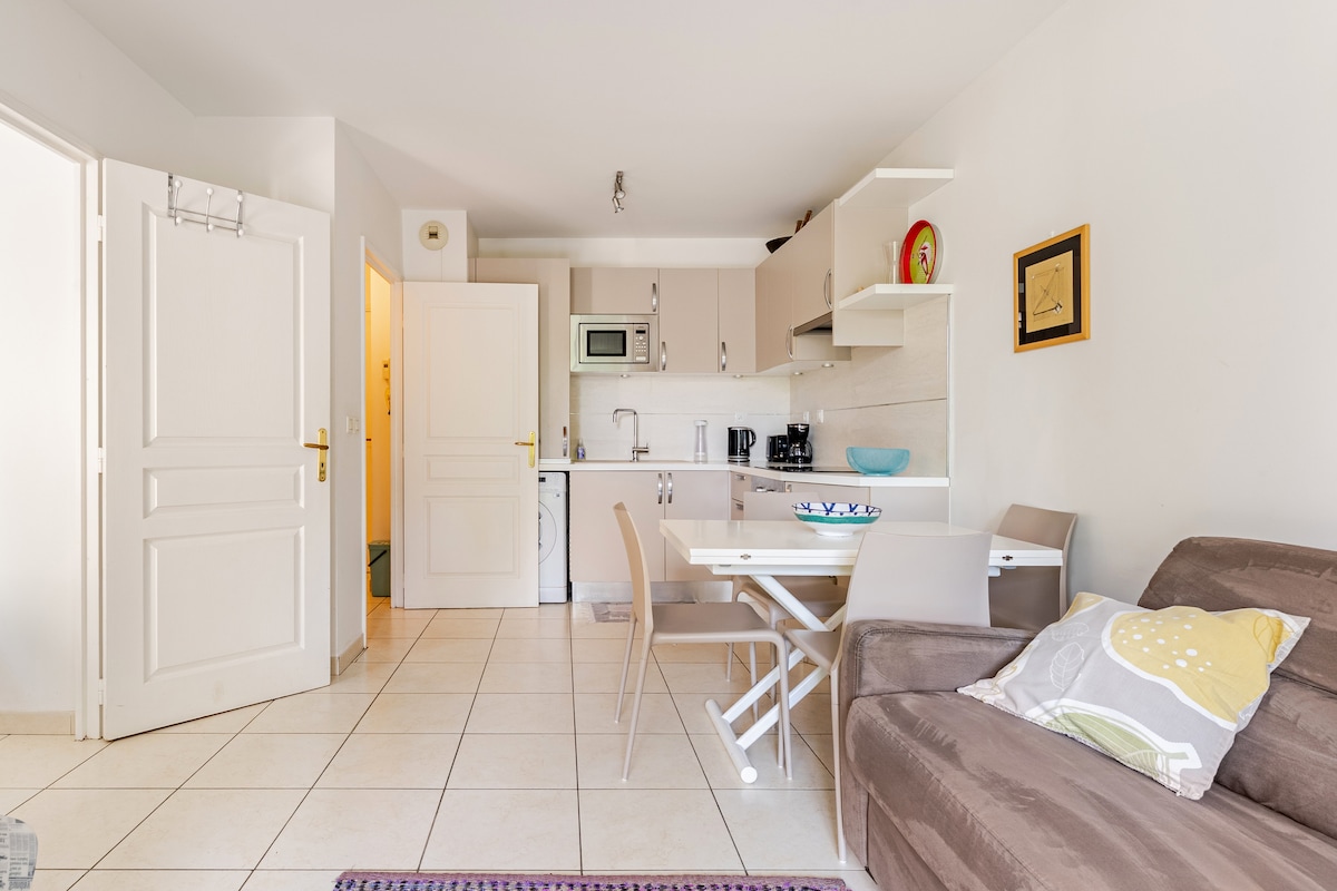 Stylish apartment with sea view, a balcony, a bedroom with a double bed, a living room with 2 sofas that can easily be transformed into 2 single beds, an open kitchen and a bathroom. It's fully equipped and just 200 m away from shops and the beach. It's located in a secure residence with 2 swimming pools (during the season). Cannes city center is just 3,5 km away and easily accessible by car, bus, train or shuttle. Address : 6 rue de la Verrerie à Cannes, "La Palme d'Azur" residence.