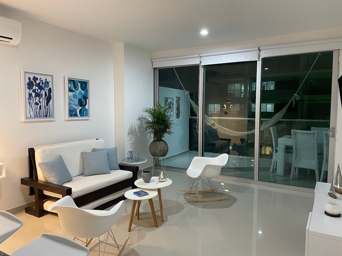 Exclusive apartment in a beachfront building with direct access to the sand. Just 7 minutes from Cartagena’s historic center, perfect for enjoying the Caribbean. Bedroom with a Queen bed + sofa bed (180x110 cm) in the living room 🛁 2 full bathrooms 🌅 Private balcony with hammock 🏊 2 pools (one beachfront), jacuzzi, and sauna 💪 Gym, children's area, and private parking 📶 300 Mbps Wi-Fi – ideal for remote work 🍽️ Close to restaurants, bars, and supermarkets Baby crib available upon request