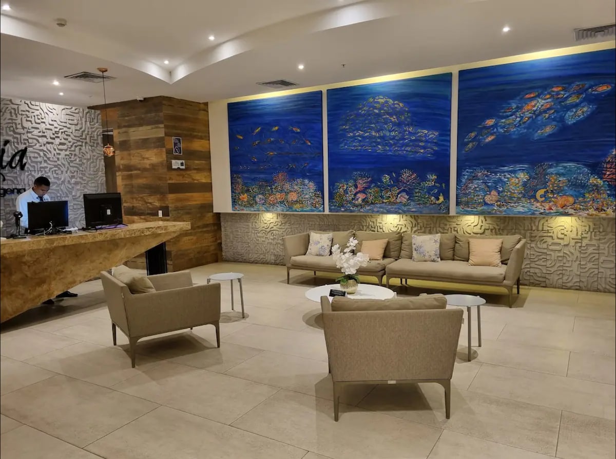 This beautiful beachfront loft is located in the Morros Zoe condominium, Serena del Mar — The Dream City — one of Cartagena’s newest and most exclusive areas. "Direct Access to the Private Beach" "Exclusive resort with magnificent spaces to relax and enjoy" "Professional cleaning and disinfection" • 10 minutes from Rafael Nuñez International Airport • 15 minutes from the Historic Walled City • 3 minutes from Las Ramblas Shopping Plaza
