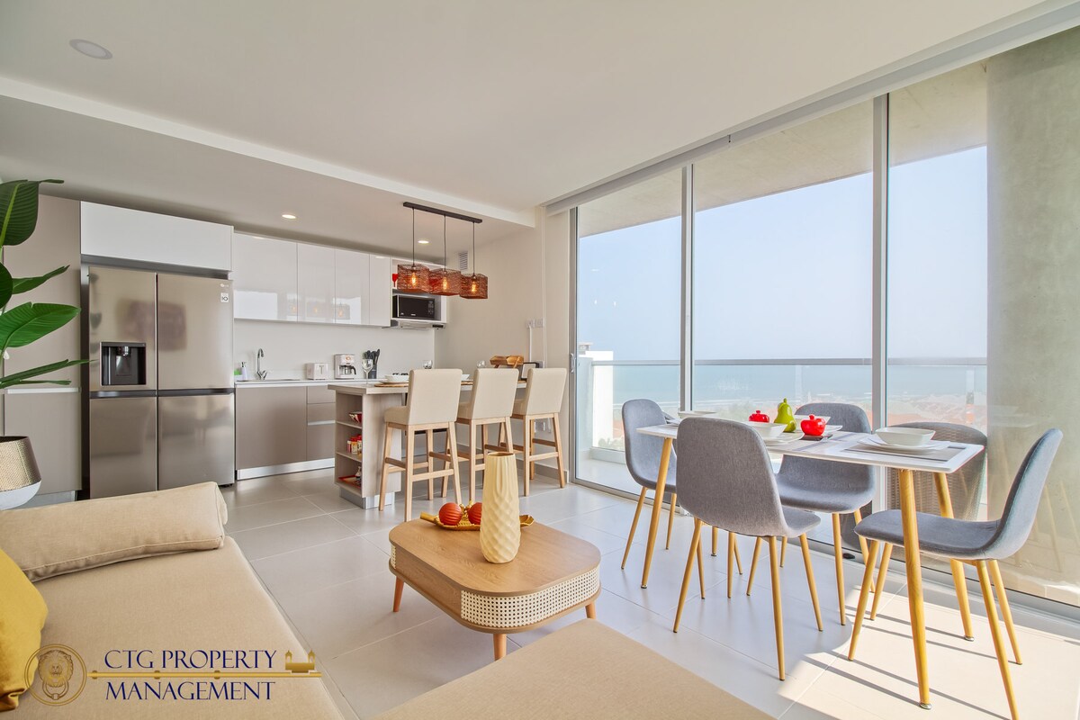 Hermoso apartamento con vista, con salida a la playa , tiene un balcón y una bella vista en la cual se puede observar la bella naturaleza del caribe, el lugar inspira a la paz y la tranquilidad de un esplendoroso lugar, esta ubicado a pocos pasos de la playa a pocos pasos de la Boquilla Tiene una zonas comunes espectaculares , centro de fitness, bar y conexión WiFi gratuita. Este apartamento ofrece aparcamiento privado gratuito y servicio de recepción las 24 horas