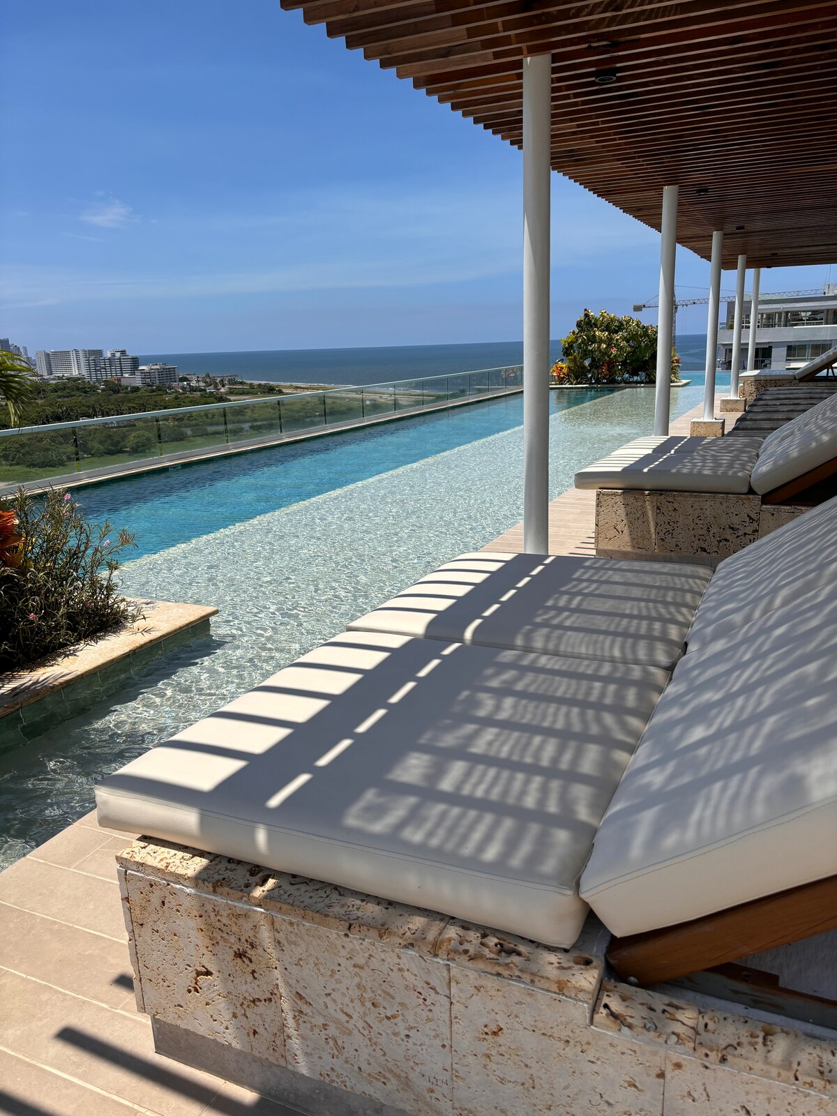 Our elegant apartment is located in one of the most complete and modern buildings in the exclusive "Cielo Mar" sector. You'll be just a few meters from "Playa Azul," one of the city's best beaches, 10 minutes from the Historic Center, and only 5 minutes from the airport. The apartment has extraordinary views of the bay and ocean, which you can enjoy from the private jacuzzi on your balcony. You can also enjoy the incredible rooftop infinity pools, complete with jacuzzi, sauna, terrace bar & BBQ