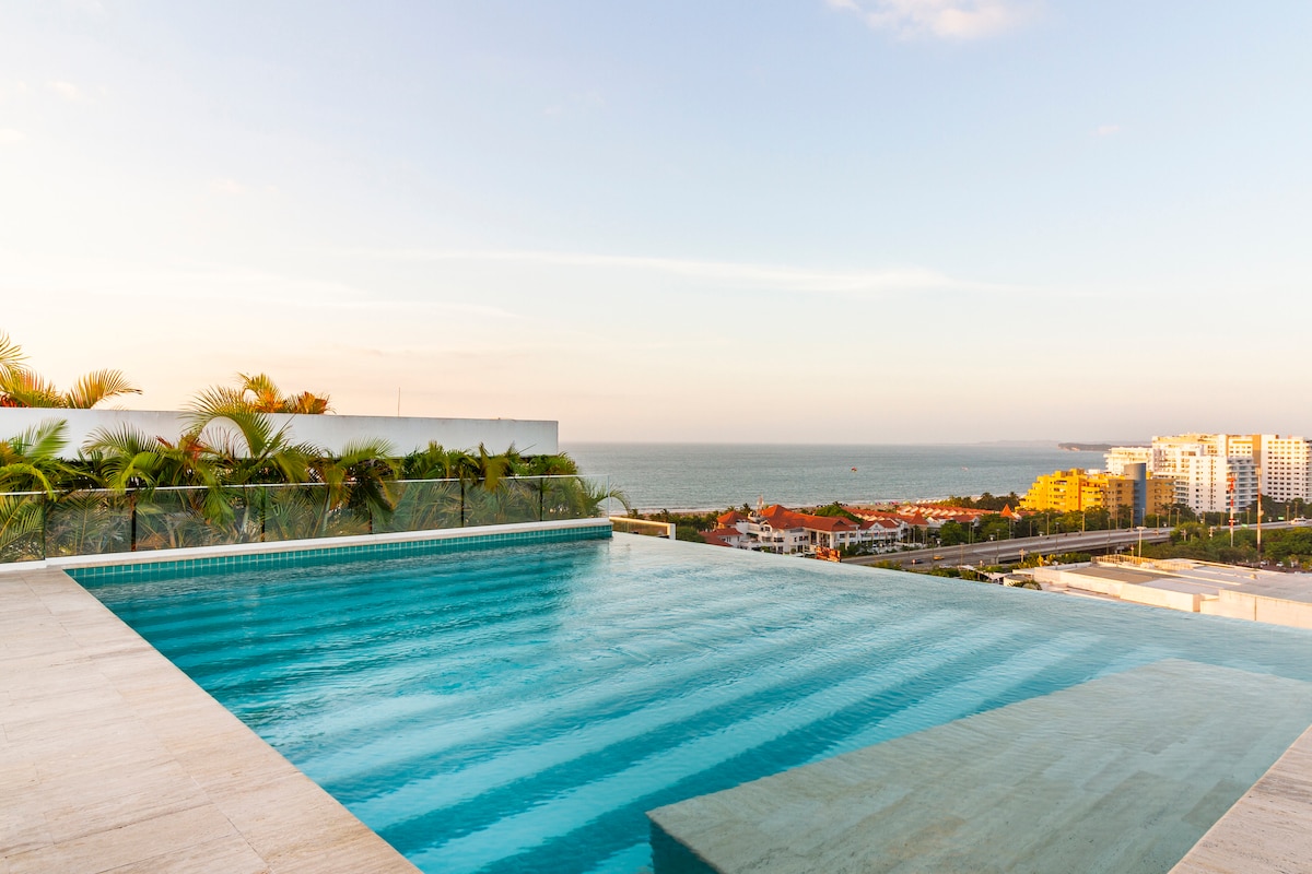 New, spectacular Roof Top 360º, Gym, steam bath, BBQ, jacuzzies, sea view horizon pool, water mirrors with tanning chairs, 25 mts. swimming lane and lounges to enjoy the sunset. Ideal for vacations, work, congress, business, special celebrations as weddings, anniversaries and many more. Tour services to the Rosario Islands, city tours, yacht, boats and fast boat rentals and many more tour options while visiting Cartagena.