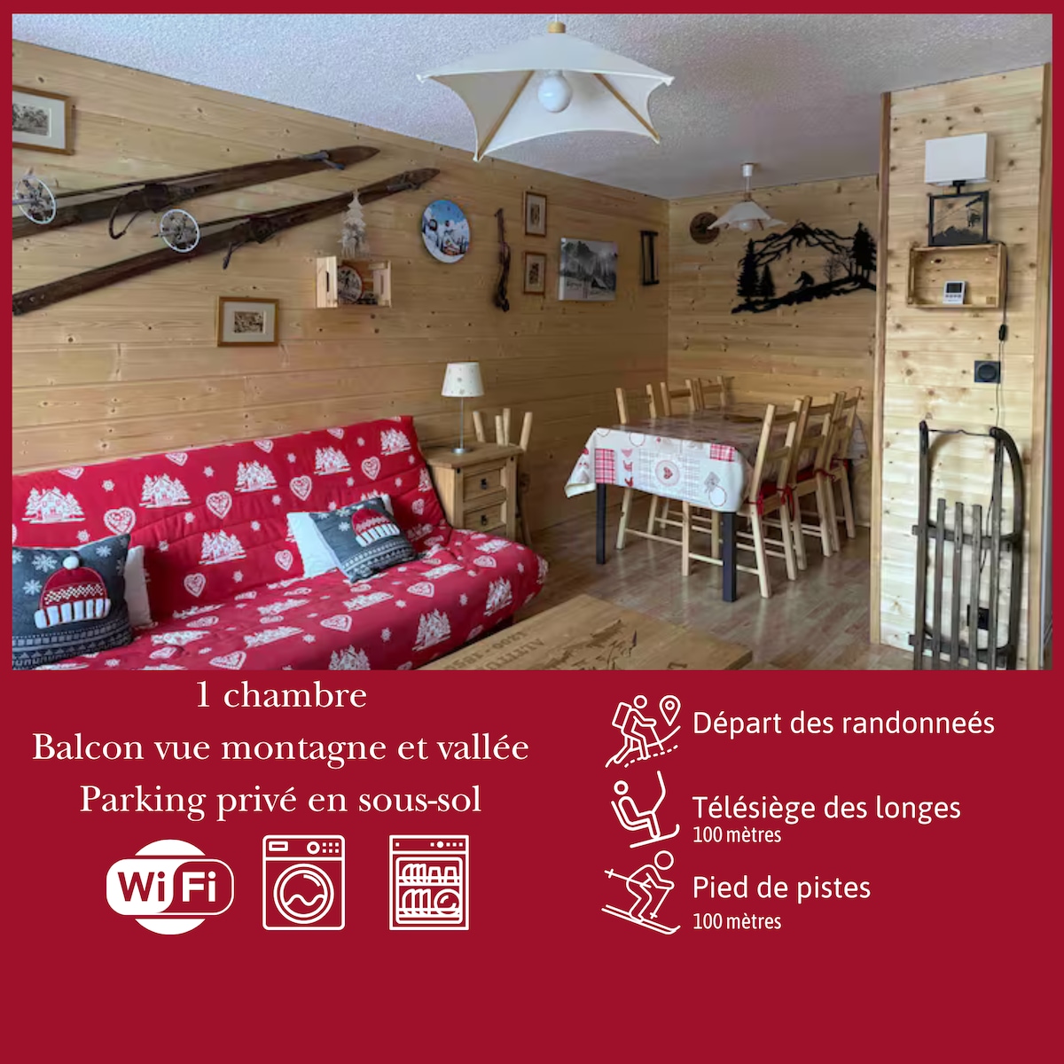 Situé dans la résidence Les Chalets de Superbesse, appartement de 33 m2, au 5 ème étage, accessible par ascenseur et escalier, avec balcon exposé sud. Il comprend : - une pièce principale avec coin cuisine tout équipée et coin salon avec canapé convertible ( 2x1 personne ) - une chambre avec lit 140 cm et placard encastré - un WC séparé - une salle de bain avec baignoire - un balcon de 9 m2 avec mobilier de jardin - un local à ski/rangement privatif