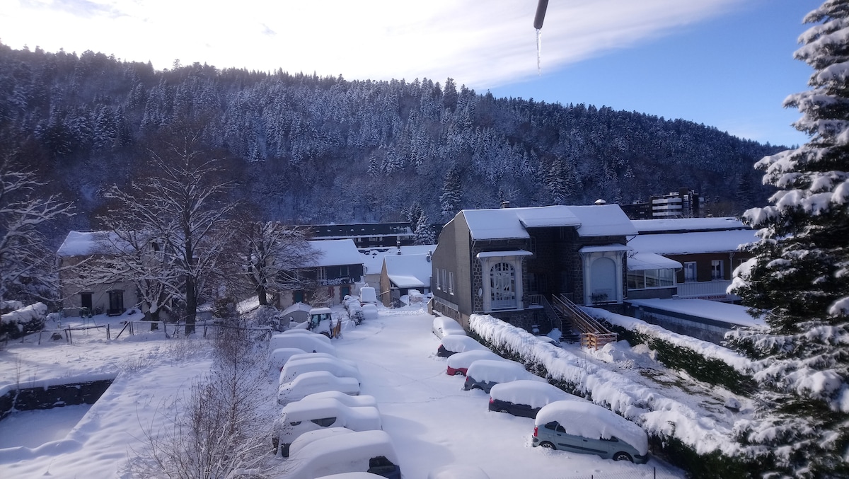 Nid douillet privé en demi étage sous la rue dans ancien hôtel rénové au cœur du village en desertification de Rochefort Montagne idéal pour randonnée, ski, et découverte de l'auvergne, du Sancy et de la chaine des puys. Baignoire à remous, climatisation, lit Emperor (2x2m), Matelas EMMA sur lattes, cuisine toute équipée avec lave vaisselle, four, four micro ondes, batterie d'ustensiles, fondue, crêpe, raclette, feux gaz et plaques induction, réfrigérateur SMEG, lave linge, sèche linge, TV LG