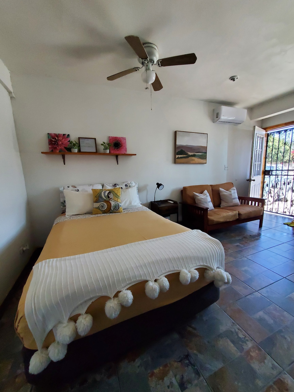Cuarto estudio pequeño con baño, independiente, muy cómodo, cama Queen, para persona sola o pareja, no apto para bebés o niños pequeños hay cristalería a la mano. Muy limpio, sanitizado a profundidad. Alejado de la calle, cerca del centro. TV con cable, internet, Con frigobar, micro y cafetera, ideal para descansar y/o trabajar, secadora de cabello y plancha. Se ubica fuera del área de la casa principal con entrada independiente, porche de entrada, completamente privado y muy seguro.